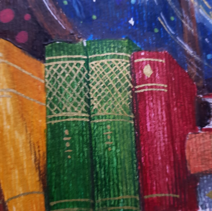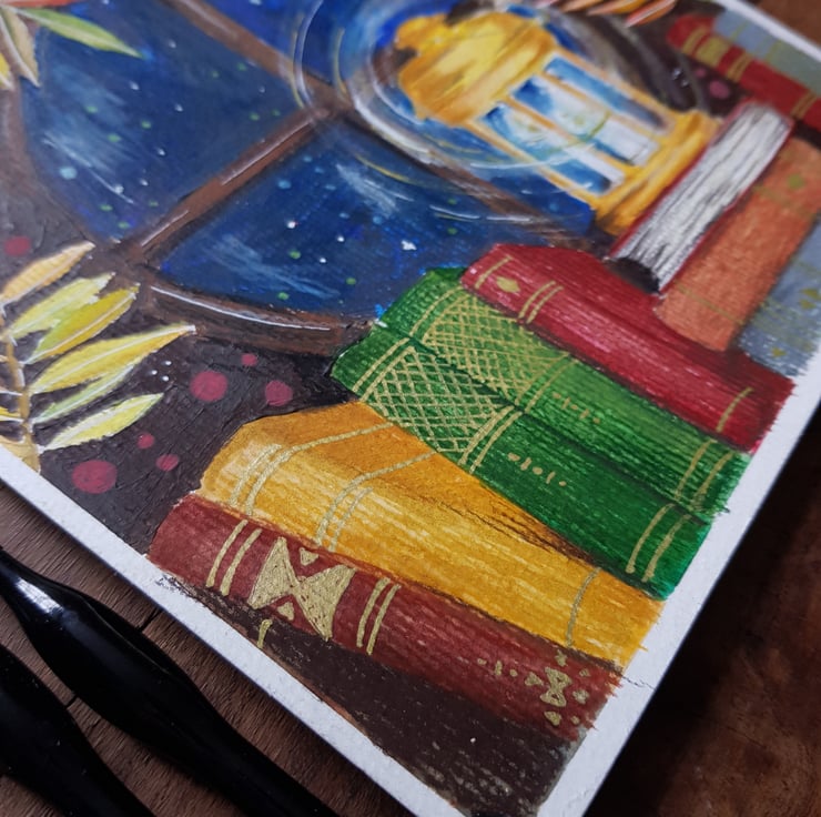 As autumn takes hold of the landscape, the leaves of the rowan tree are turning bright orange and gold; these colours were the inspiration for my artwork. The rowan tree is considered a protective tree in British folklore. Under its foliage, I depicted a lantern with a warm glow and vintage books to add more cosiness to the illustration.