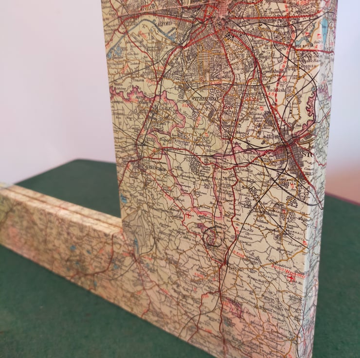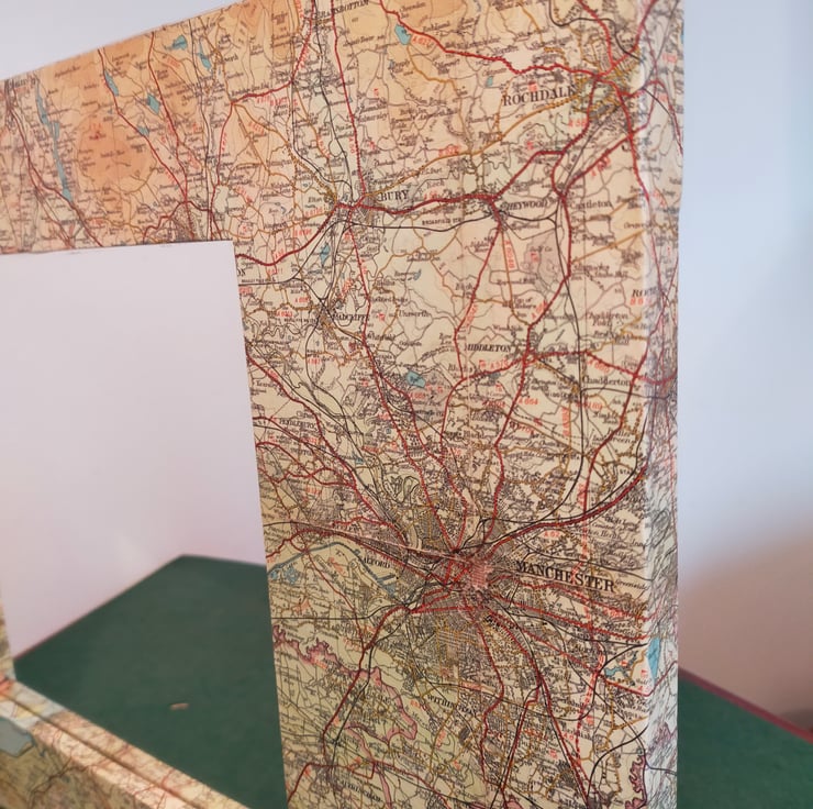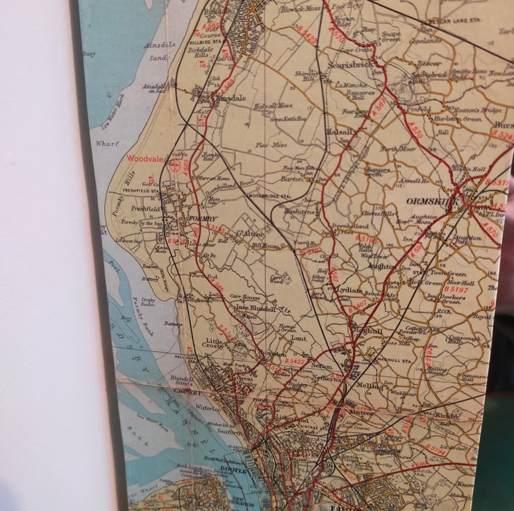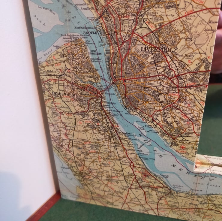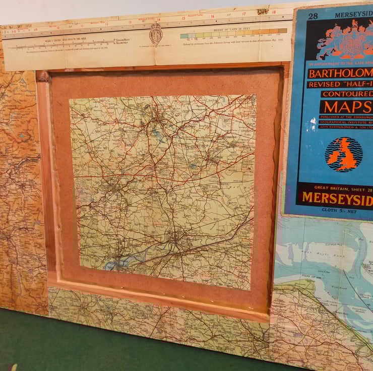 Whether you're from Manchester, Liverpool or the bits in between, coming from the North West is something to be proud of, and this mirror celebrates that heritage. The frame is made bespoke from reclaimed pine so as to fit a good portion of sheet number 28 in the Bartholomew map series. These maps, now sadly no more, are far more colourful and decorative than their OS equivalents. Sheet 28 is broadly titled Merseyside which is, I suppose, strictly true as the Mersey begins in Stockport. Sincere apologies to the citizens of Warrington and Wigan for placing the mirror over your patch, but the missing towns are glued to the back. This mirror makes for a wonderful talking point as there is so much more green and undeveloped land than nowadays.