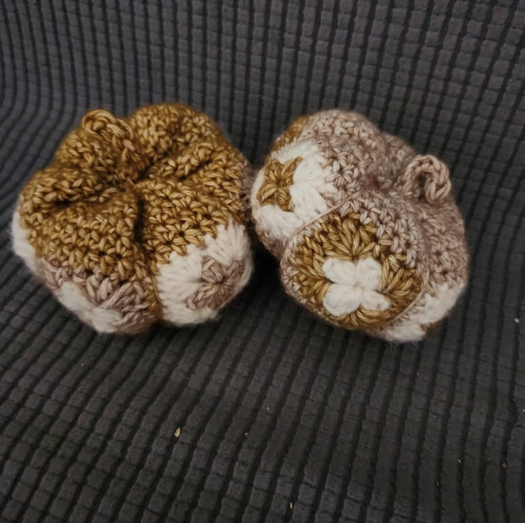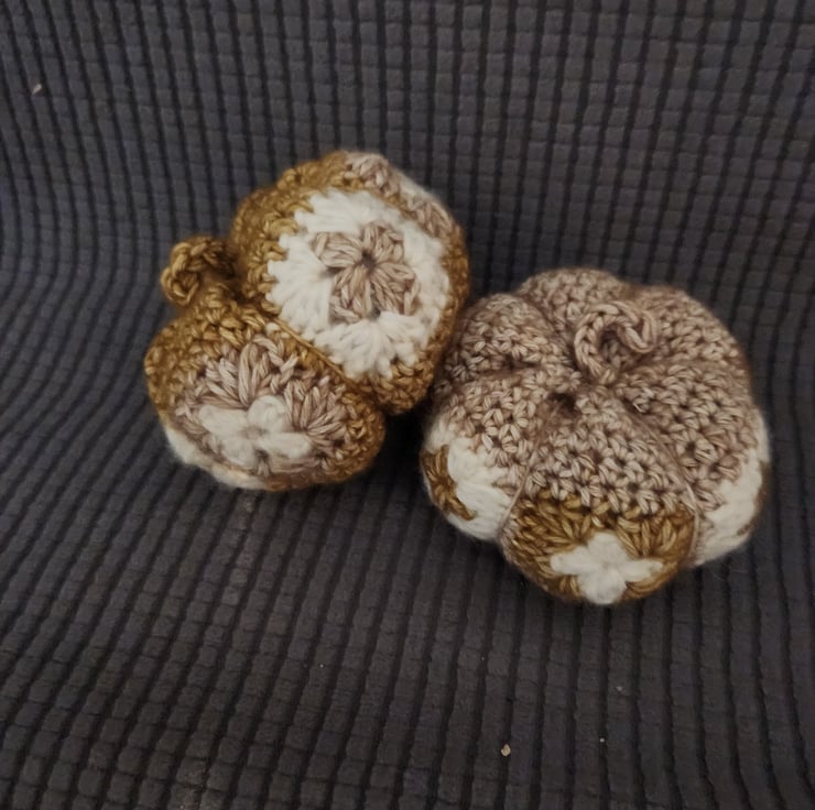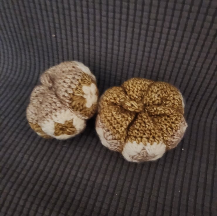2 Halloween pumpkins, Jack-O’Lantern. Hand made amigurumi crochet. Measures approximately 6cm across.