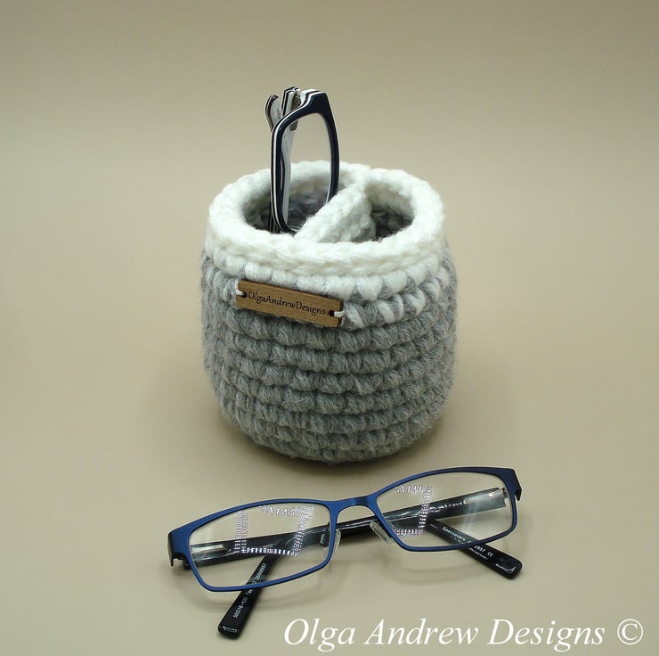 This hand crocheted round small-medium divided eyeglass holder stand could be very useful to keep your glasses safe and handy. The sides of the multiple eyeglasses holder are very sturdy, strong and dense. This eyeglass storage is very practical, and you can use this soft glasses holder also as a nightstand or desk organizer. This double eyeglasses stand would also be a great gift for mum, dad, friends and colleagues.