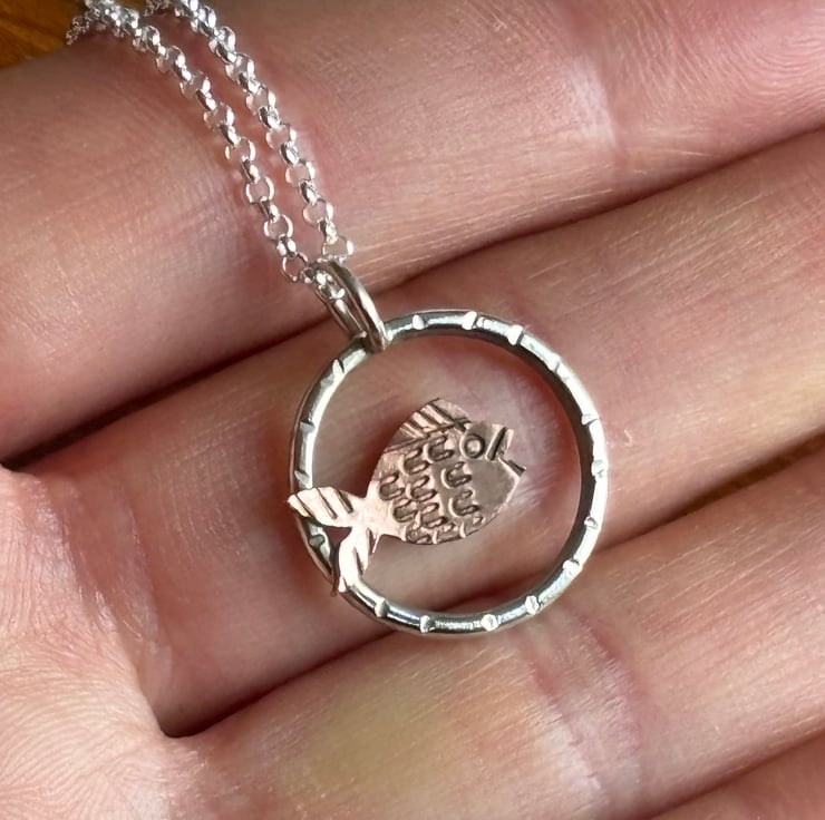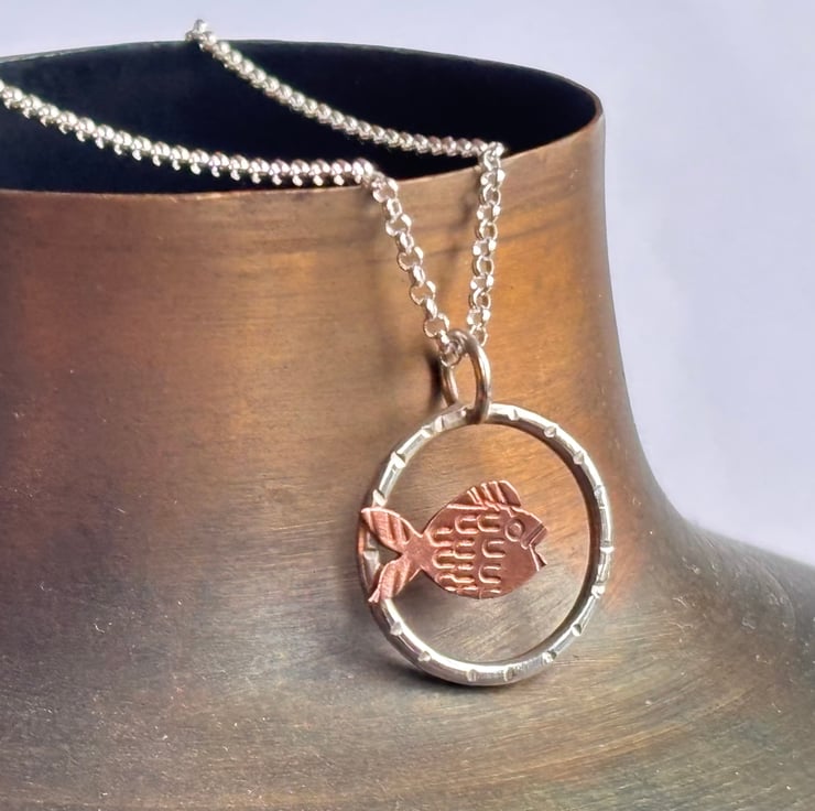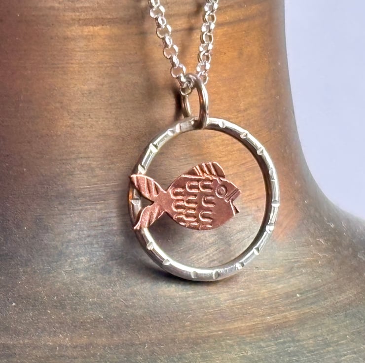 A cute copper fish on a sterling silver circle hung from an 18 inch sterling silver chain.