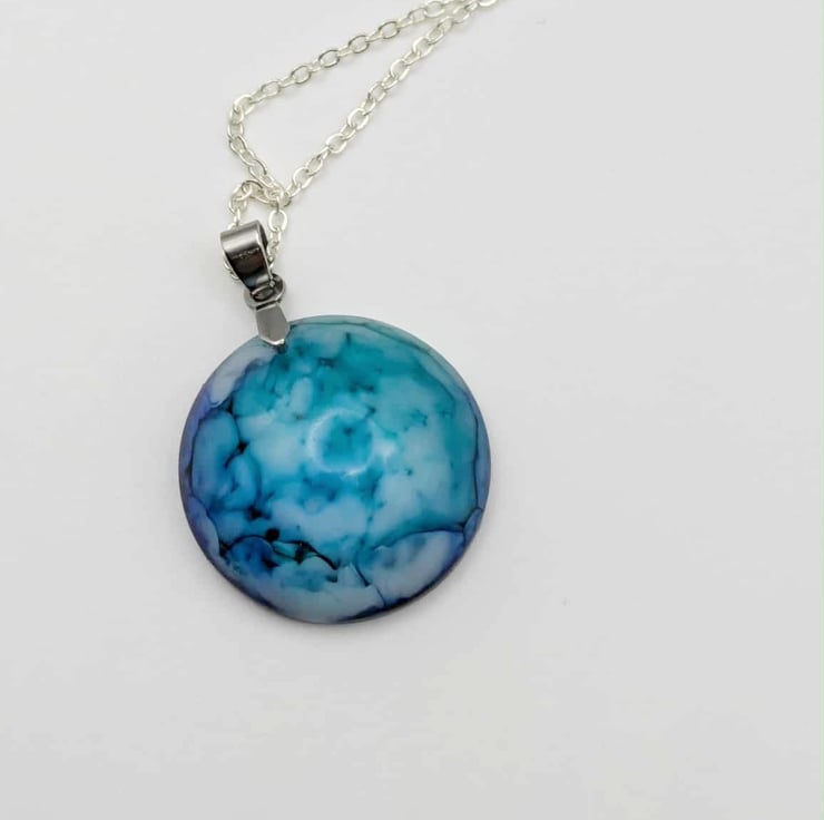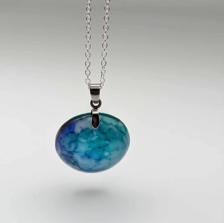 The stunning marbled pattern is created with translucent resin in shades of aqua, turquoise, and deep sea blue, making each necklace truly one-of-a-kind.