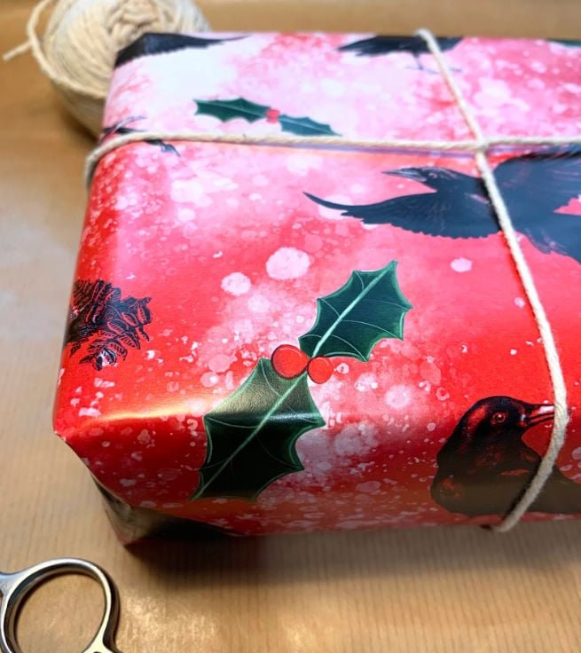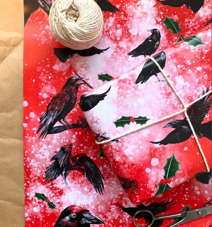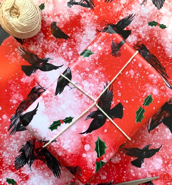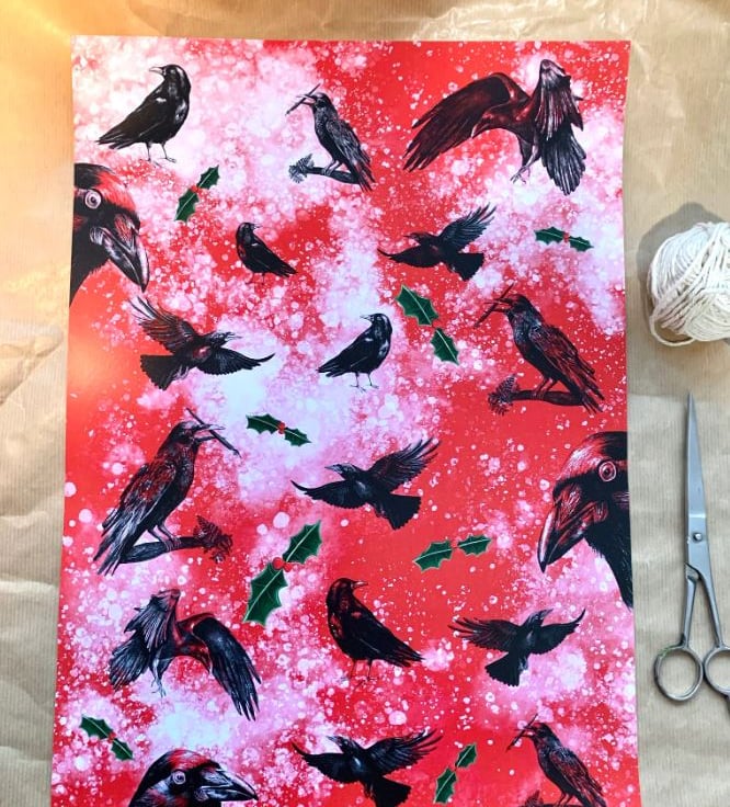 This design features a variety of crows with holly leaf detailing, making it perfect for those who love all things corvid.