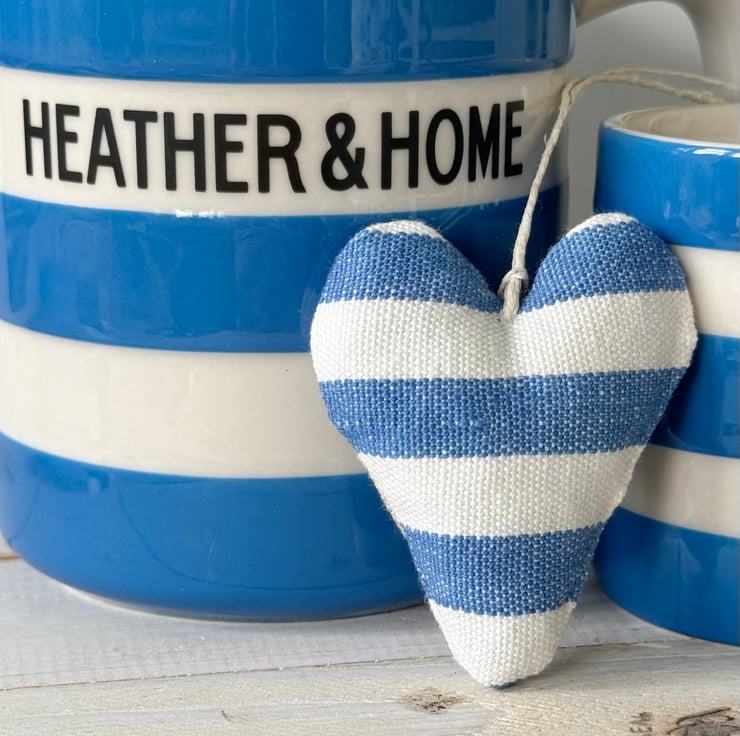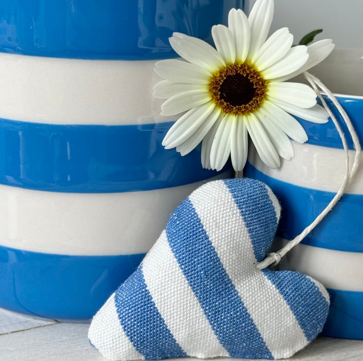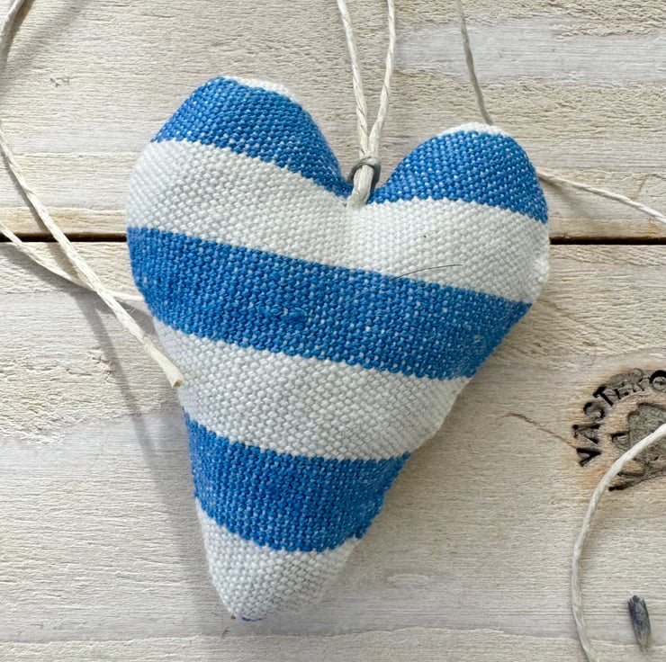 Handmade in superior quality woven cotton, with classic Cornish blue and white stripes front and back, filled with wonderfully fragrant Hampshire lavender and complete with natural hemp twine hanging ties.