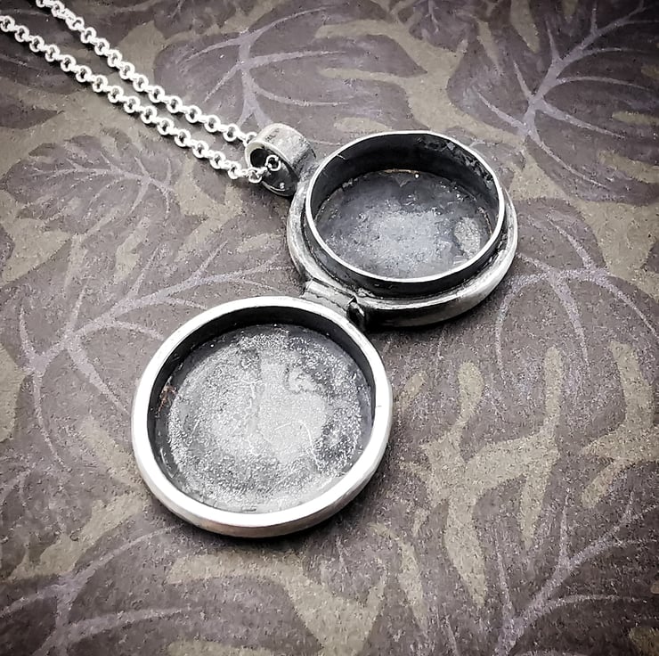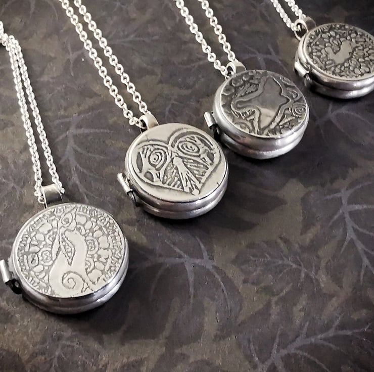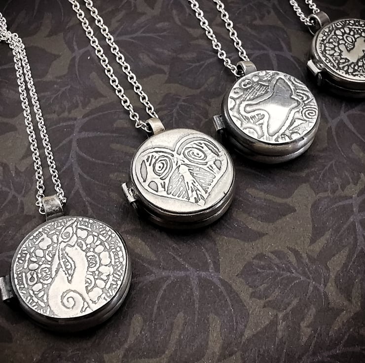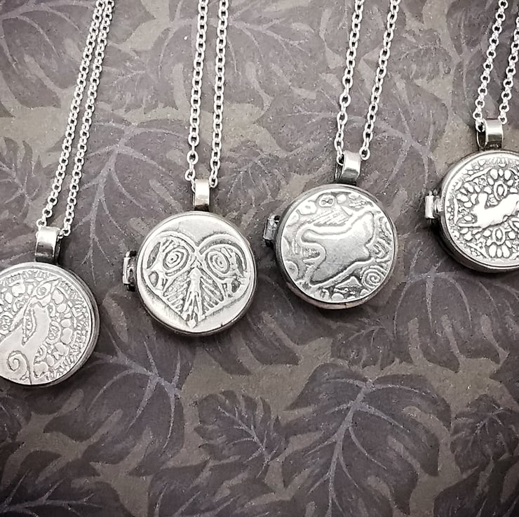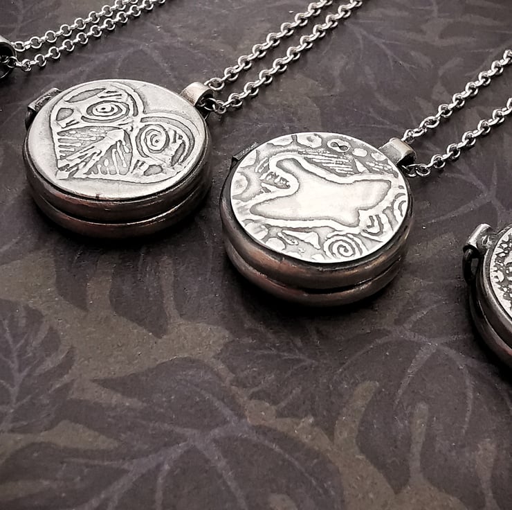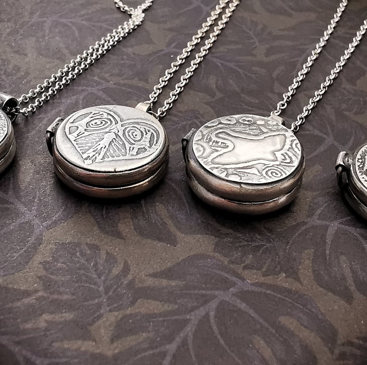 Discover this exclusive collection of solid sterling silver lockets, individually handcrafted in the UK. Each round locket features a diameter of approximately 1.8cm and is presented on a sterling silver chain, available in 16-inch or 18-inch lengths. They carry our officially registered maker's mark, guaranteeing hallmarked British quality certified by the Sheffield Assay Office. Choose from four distinct etched designs: Moon Gazing Hare Locket, Leaping Hare Locket, Flying Bird Locket, or Heart Locket.