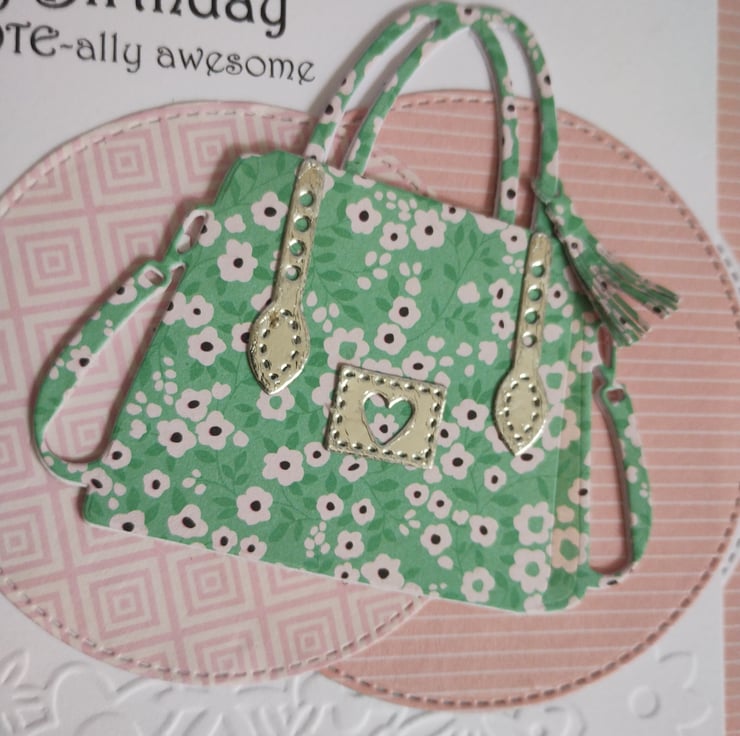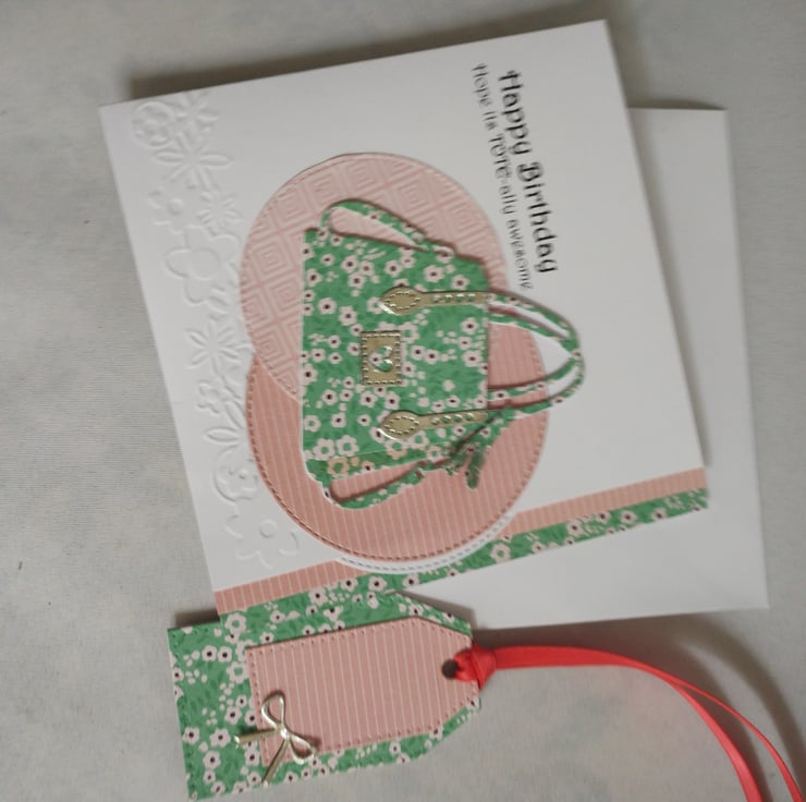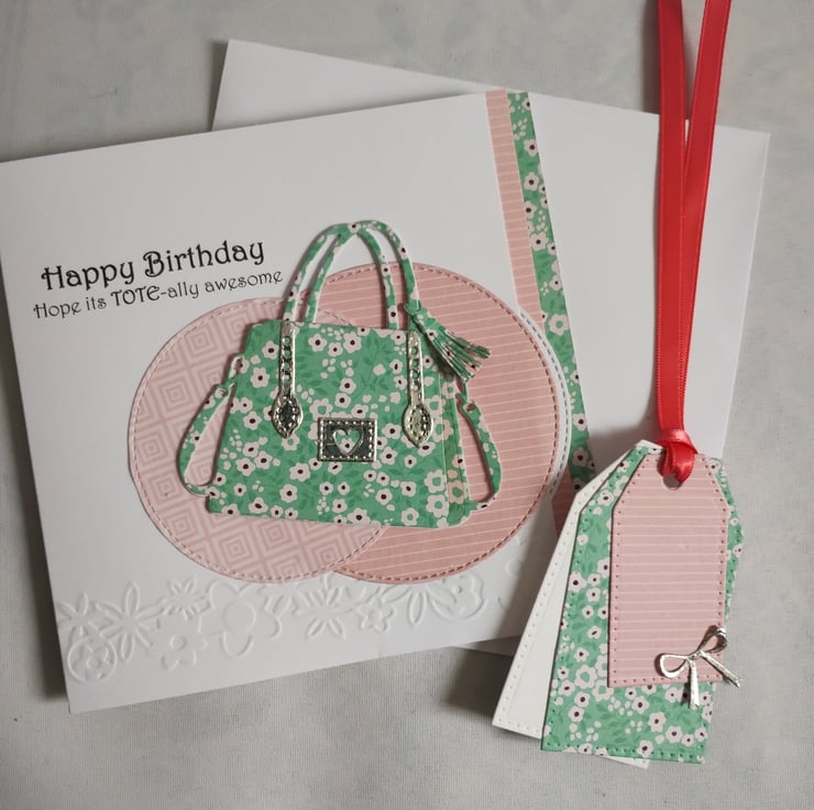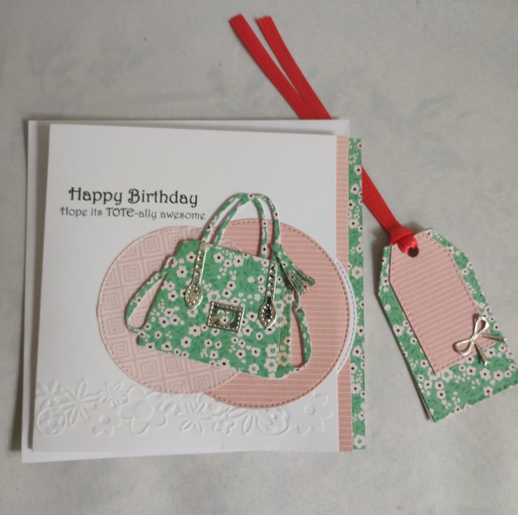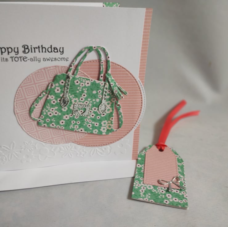 This fab birthday card features a gorgeous green flowery tote bag, complete with fabulous tassel and comes complete with a matching gift tag for your gift to the recipient.