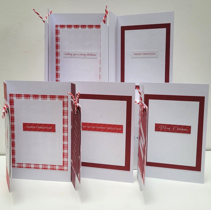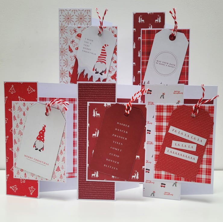 This set of 5 handmade cards feature festive patterns on a spit front card containing various sentiments and imagery on the front, as well as a coordinating Christmas sentiment on the lined interior of the cards.