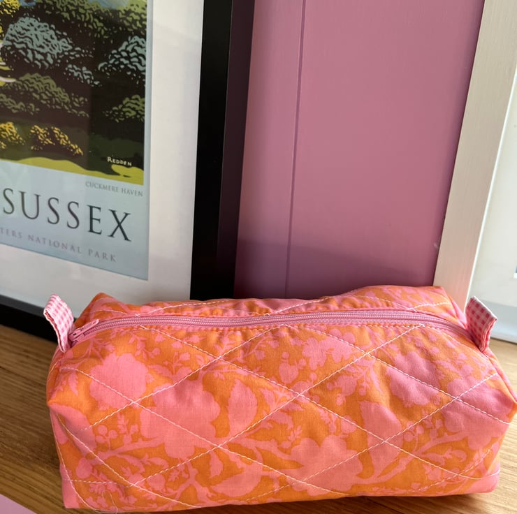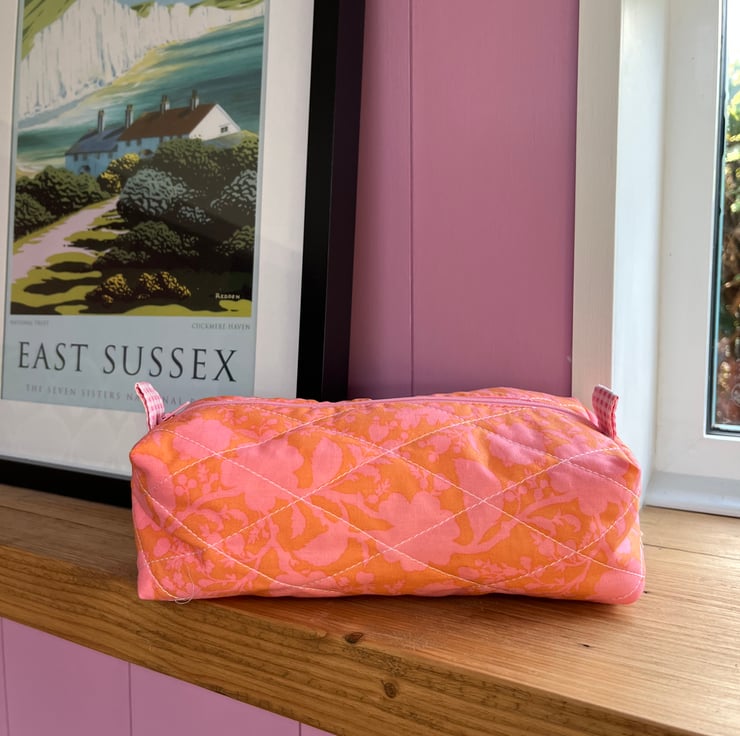 Quilted orange and pink floral make up bag