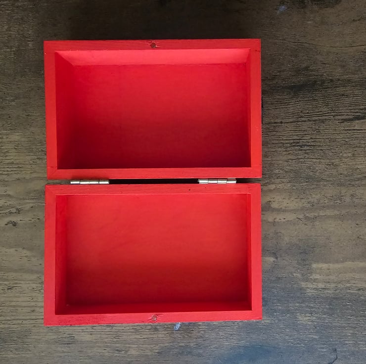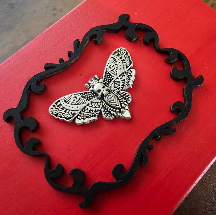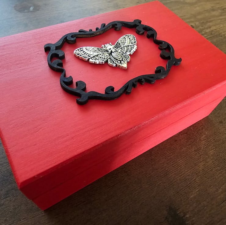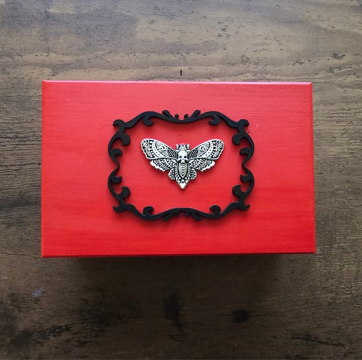 Death Head Moth red wooden jewellery or trinket box. Silver metal moth housed in black handmade wooden cameo frame on the lid. Black wood diamond shaped star detail on each short end of the box.