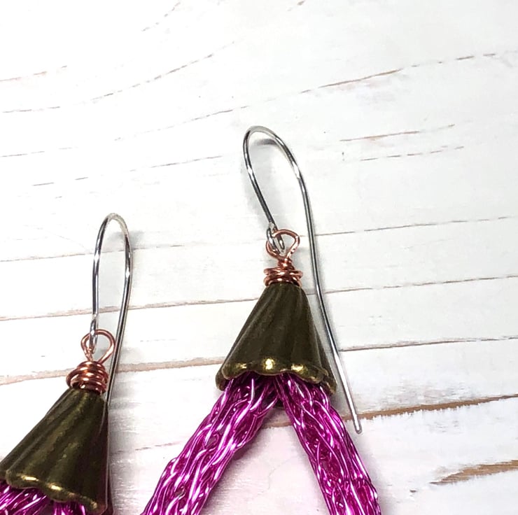 These are woven from silver plated copper wire that has then been plated in a variety of colours, in this case a lovely pale ish but quite vibrant pink with a little hint of silver showing through in places.