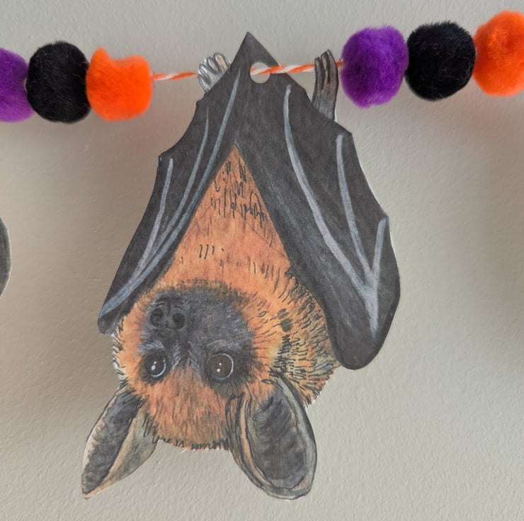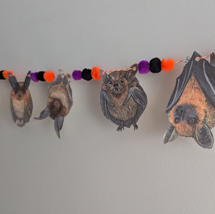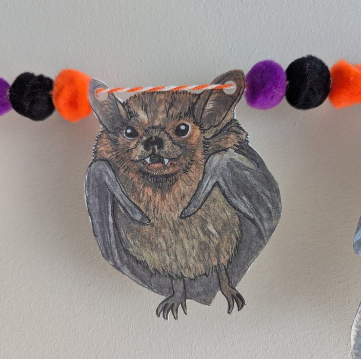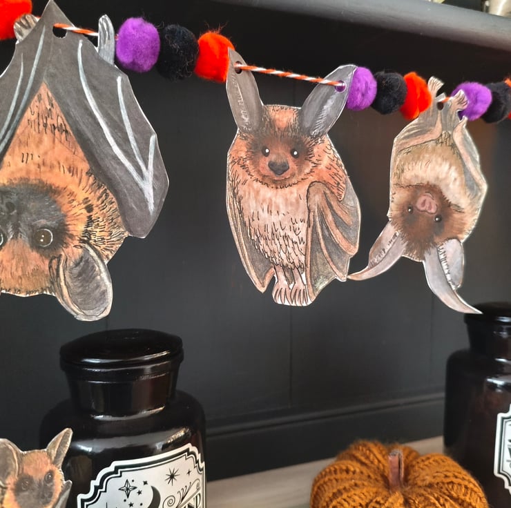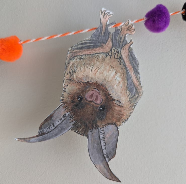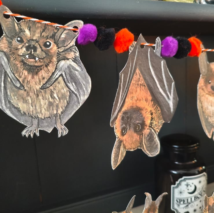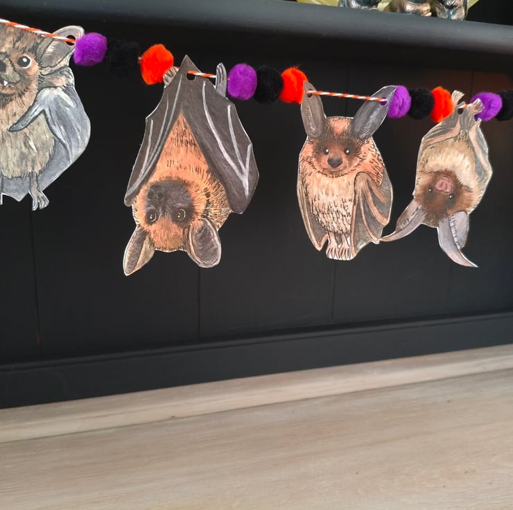 I drew and painted each Bat myself using watercolours, and then scanned in to print the Bats out digitally on to 300gsm hammered card to create the bunting. The bunting also features Halloween coloured pom poms which are threaded onto the twine.