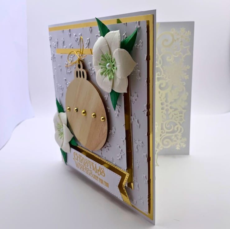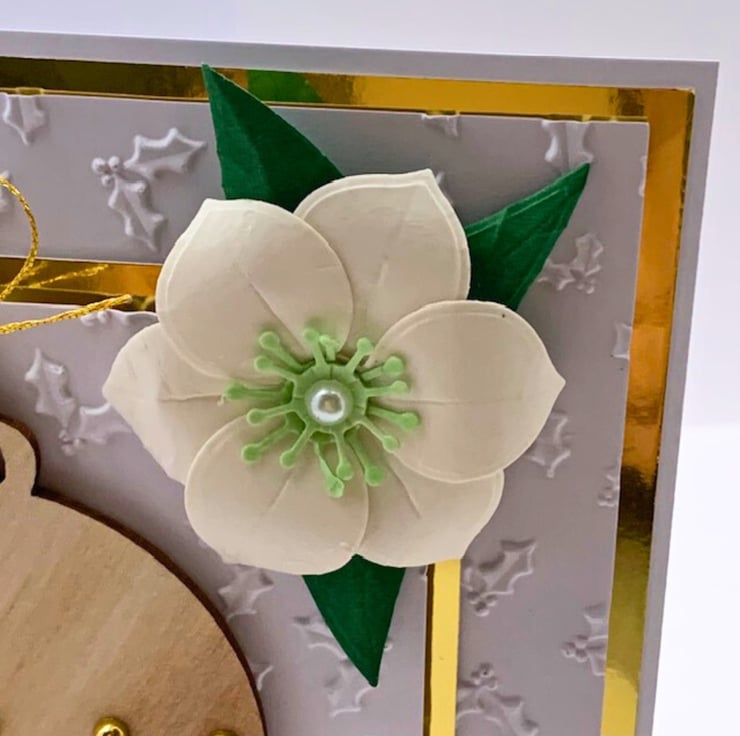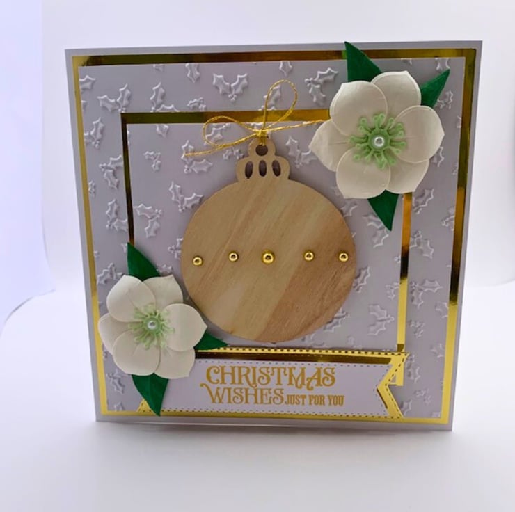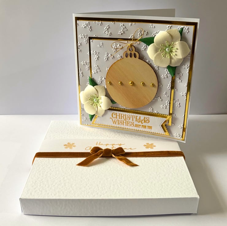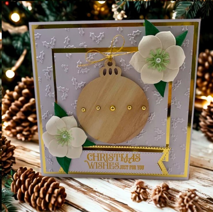 This design features a delicate wooden bauble embellishment with gold twinkling pearls and layered Christmas Rose (Hellebores), set against a holly-embossed background. Finished with gold mirror card, gold twine, it brings a touch of festive luxury.