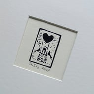 After drawing each piece, I carefully hand carve the lino plate. I mix all my colours by hand from professional water based printing inks and the lino blocks are then inked and put it into my printing press. Lastly I print them individually straight onto high quality printing paper. If there is more than one colour involved in a design this process is then repeated.