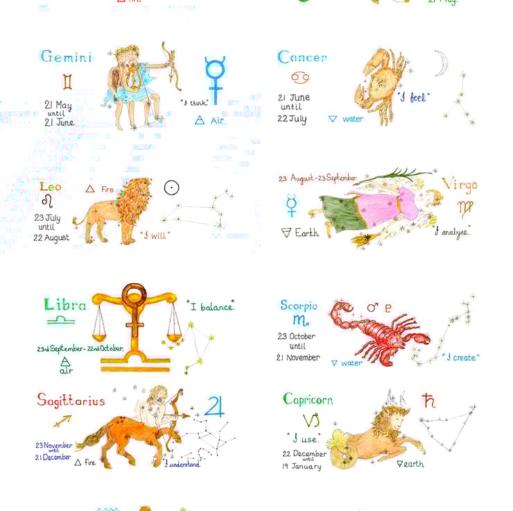 A series of 12 original watercolour illustrations featuring an artistic interpretation of the constellations. Each design is also available individually if you prefer.