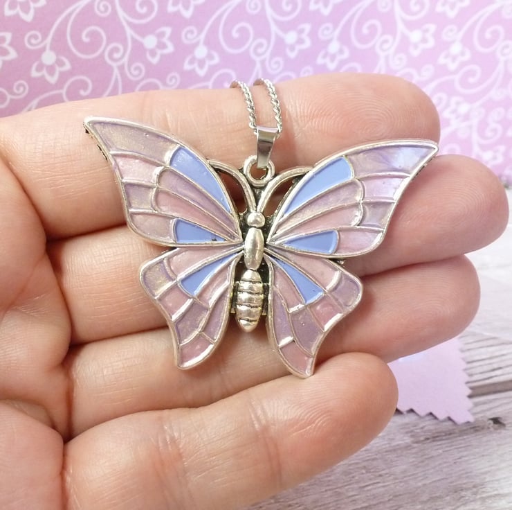 The butterfly pendant measures 55mm from wingtip to wingtip, and 40mm from top to bottom. The Stainless Steel chain is 45cm. This can be made longer at no extra charge - please message me.