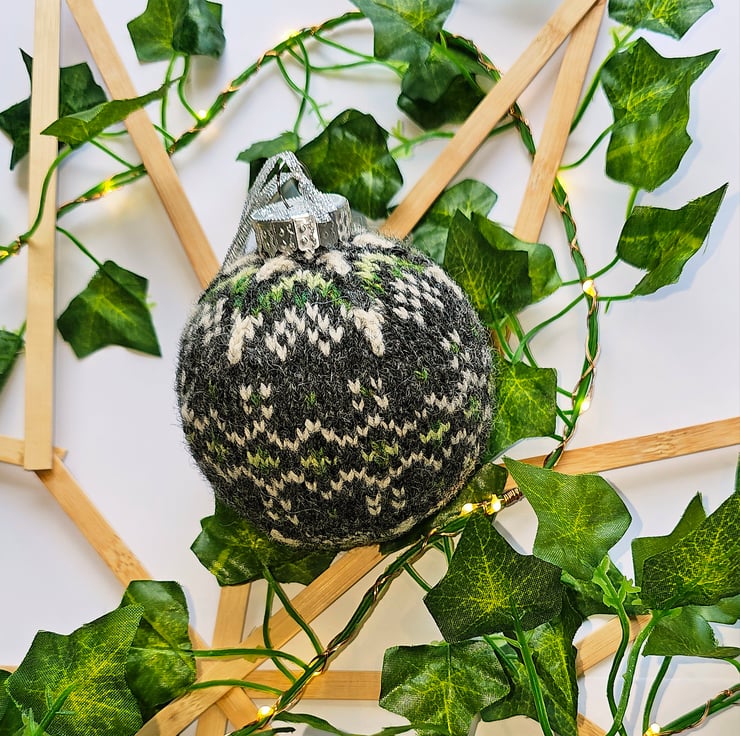 The bauble is knit in the round, around a shatterproof plastic bauble. This means they hold their shape perfectly, and are lightweight. This is not a toy and should not be given to children or pets.