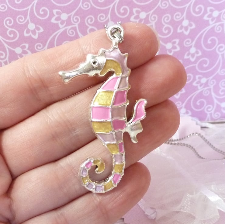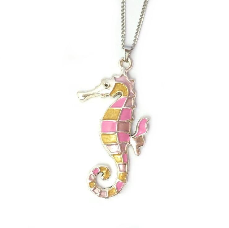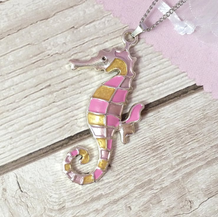 Pink seahorse pendant, hand painted in shades of deep pink, gold and iridescnet pale pink enamels. Seahorses can be made in custom colours - just message me to request one for yourself.