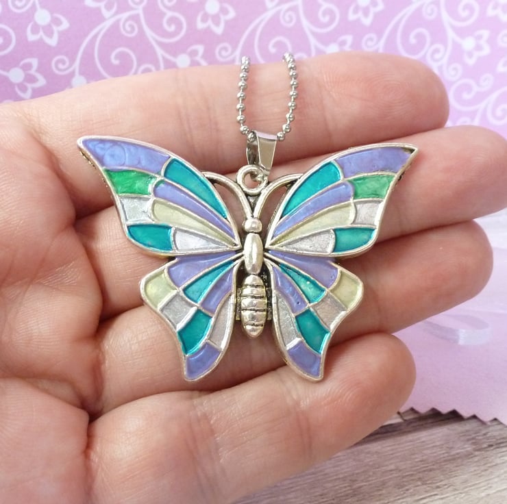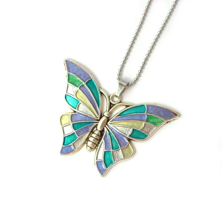 Painted with enamels in silver, lilac, metallic green and turquoise, this silver metal butterfly is presented on a Stainless Steel ball chain. Each pendant is painted individually - a custom design in your favourite colours can be created upon request.