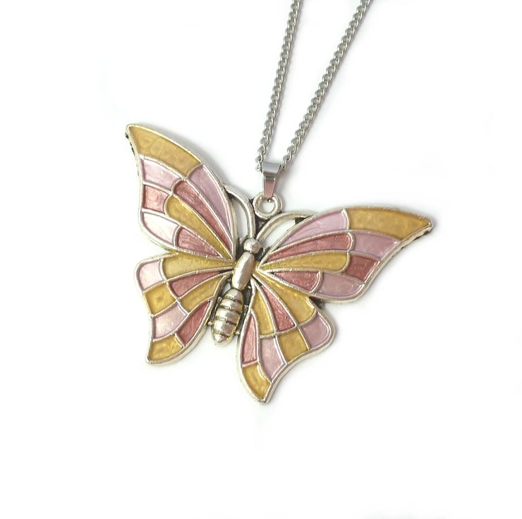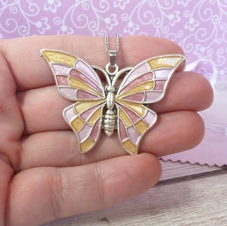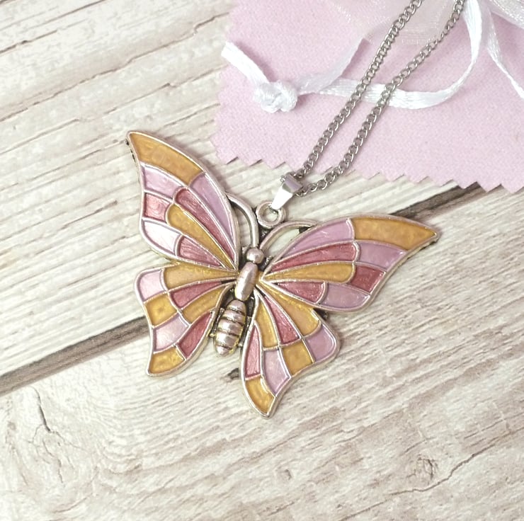Painted with bright enamels in gold, pastel pink, and rose gold, this silver metal butterfly is presented on a Stainless Steel ball chain. Each pendant is painted individually - a custom design in your favourite colours can be created upon request.