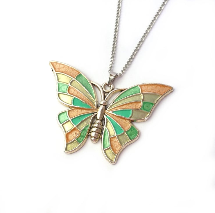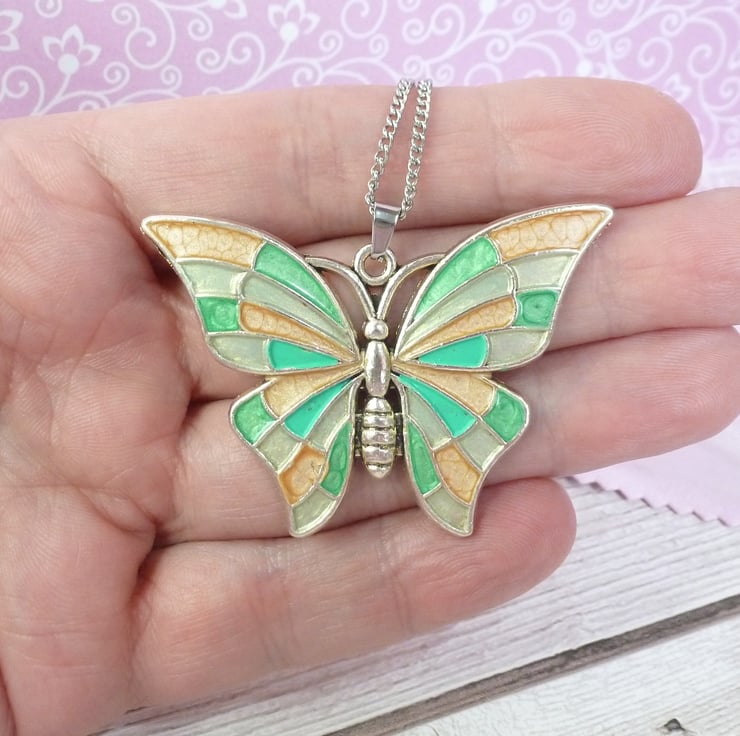 Painted with gold, iridescent lime green, and metallic emerald green enamels, this silver metal butterfly is presented on a Stainless Steel ball chain. Each pendant is painted individually - a custom design in your favourite colours can be created upon request.