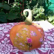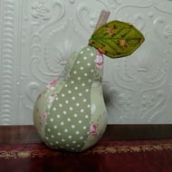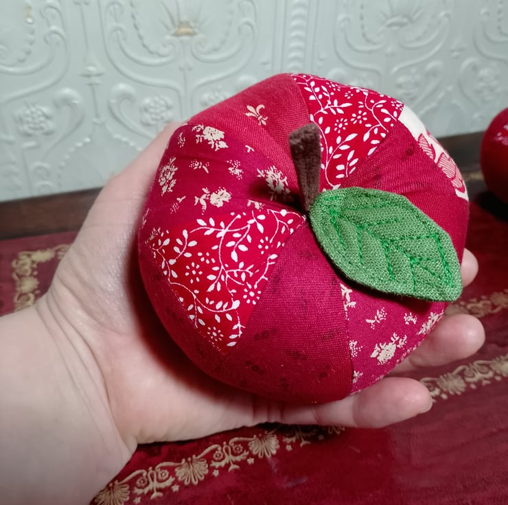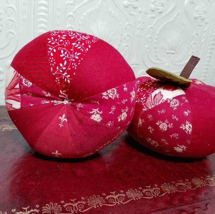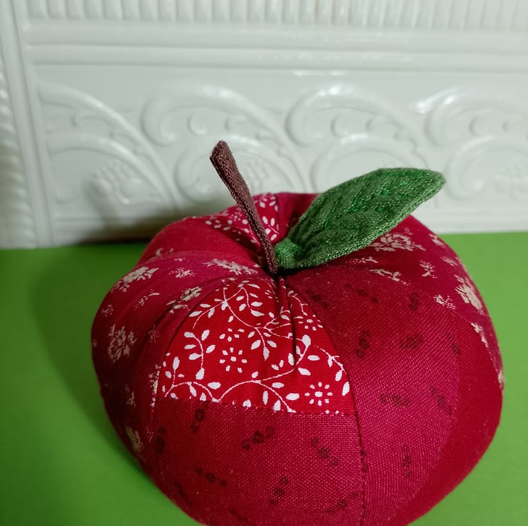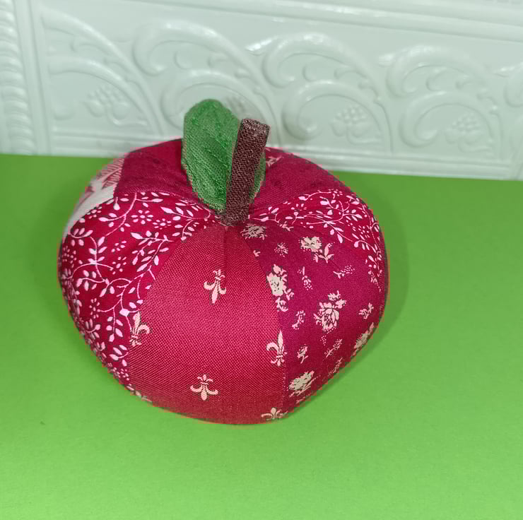 Apple. Handmade. Approximately 10 cm wide and 7 cm tall (excluding stalk). Patchwork. Each apple is unique and has it's own individual pattern. The same set of fabrics is used for all the apples, which create different patterns. 100% cotton. Stuffed with hollow fibre. Can be used as decoration or pincushion.