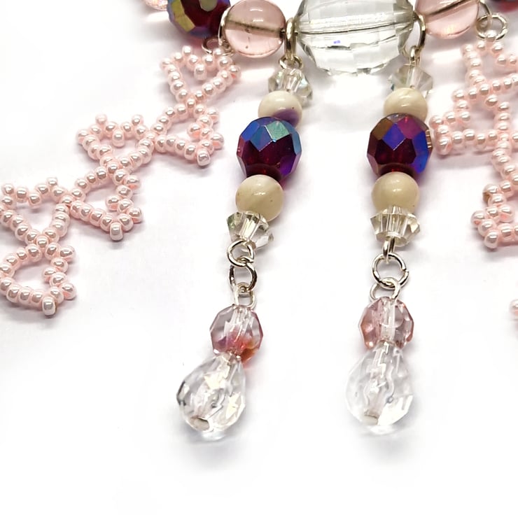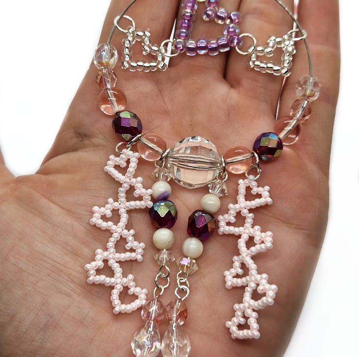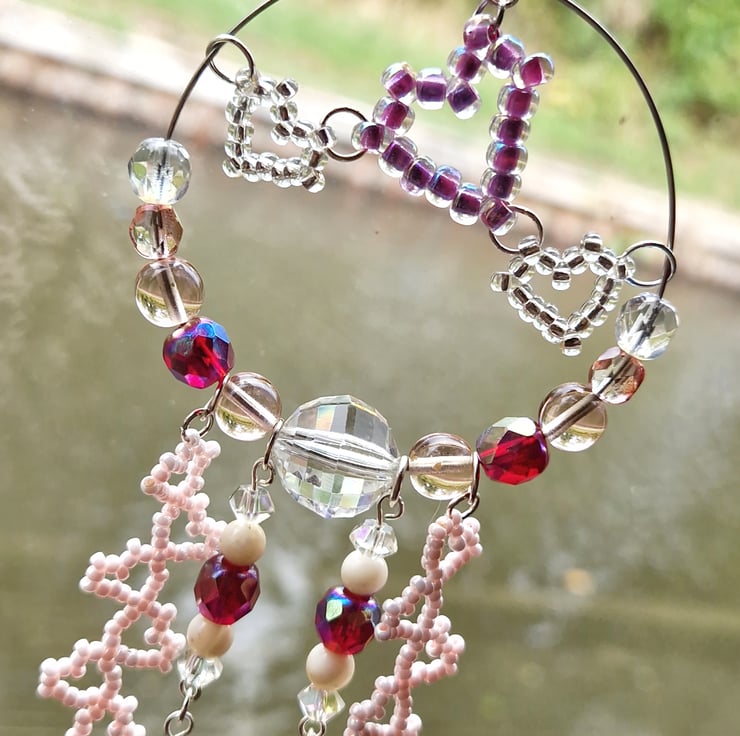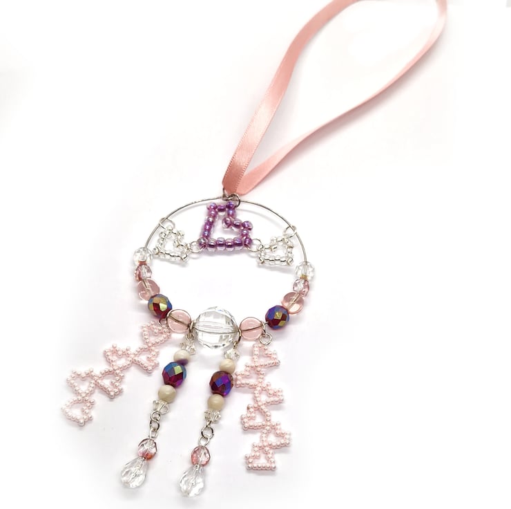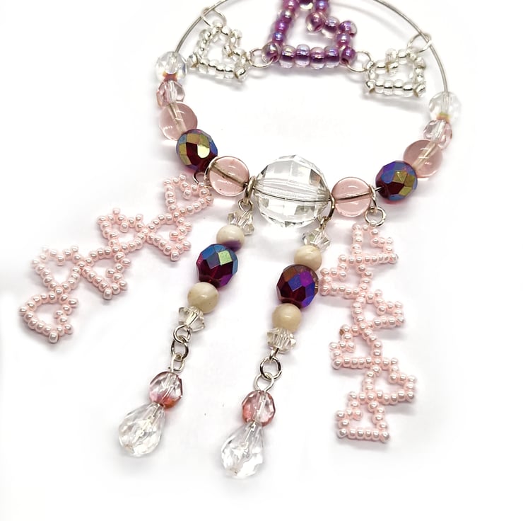 This pink purple and silver love hearts beaded hanging decoration has been lovingly created to bring some joy and mindfulness to your space.