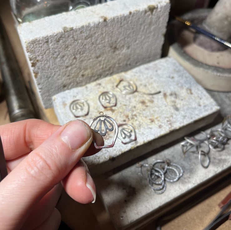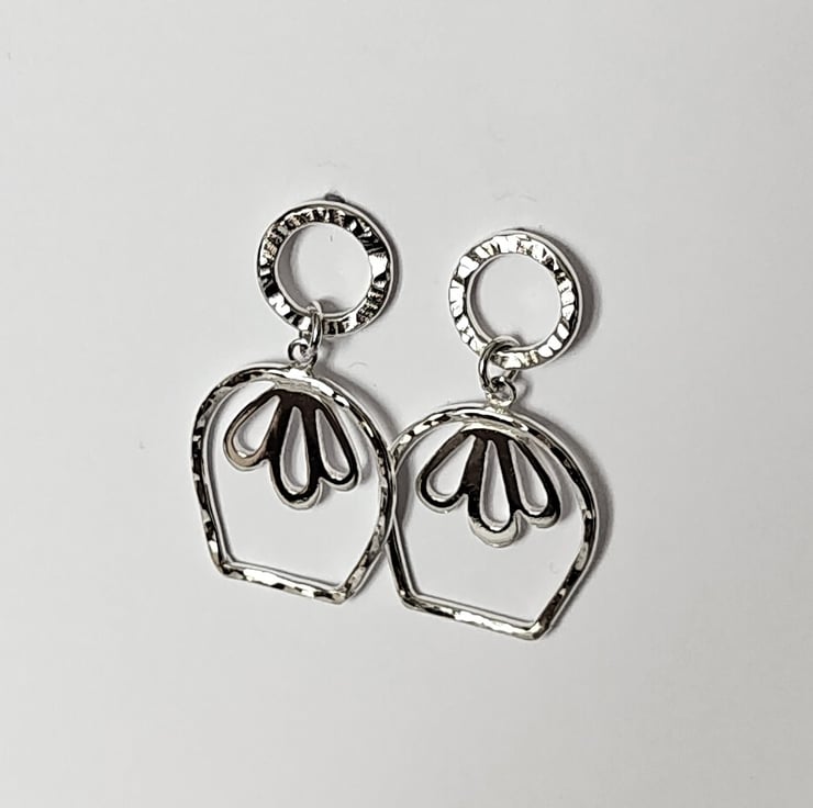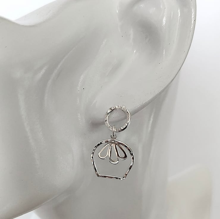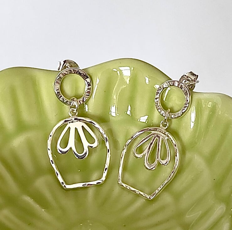 These delicate sterling silver tulip earrings are handmade, texture is added with a hammer, making every piece unique. These beautiful floral earrings hang from hammer textured circle studs and have sterling silver scrolls. The texture detail makes these stunning earrings catch the light beautifully.