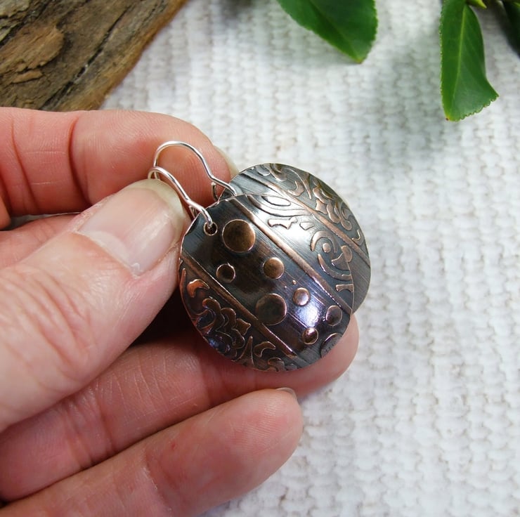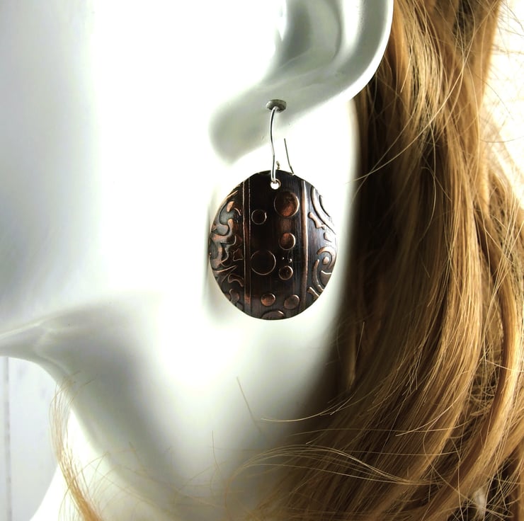 I have created the oval shapes from copper sheet, hand cut and embossed with a pattern then given an antiqued finish. Fitted to sterling silver ear hooks
