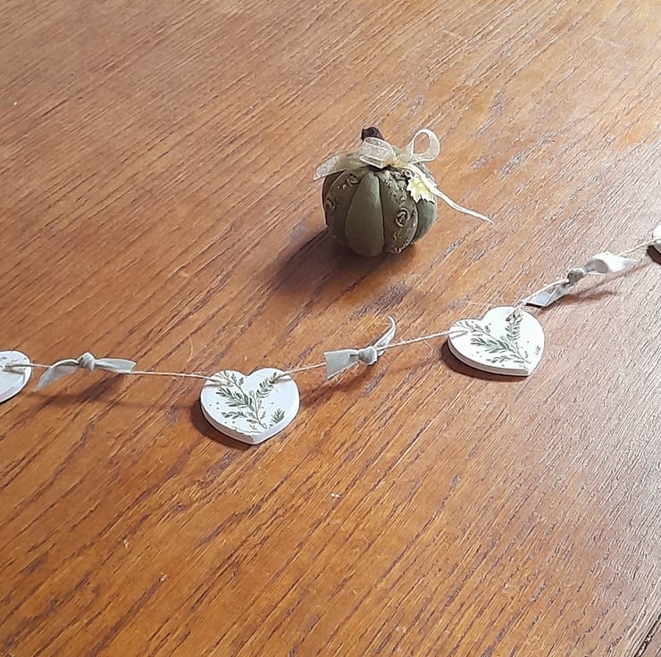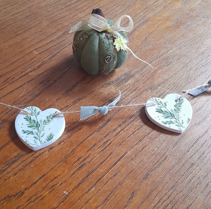 Handmade Clay Hearts have been decoupaged with a pretty soft green fern design.