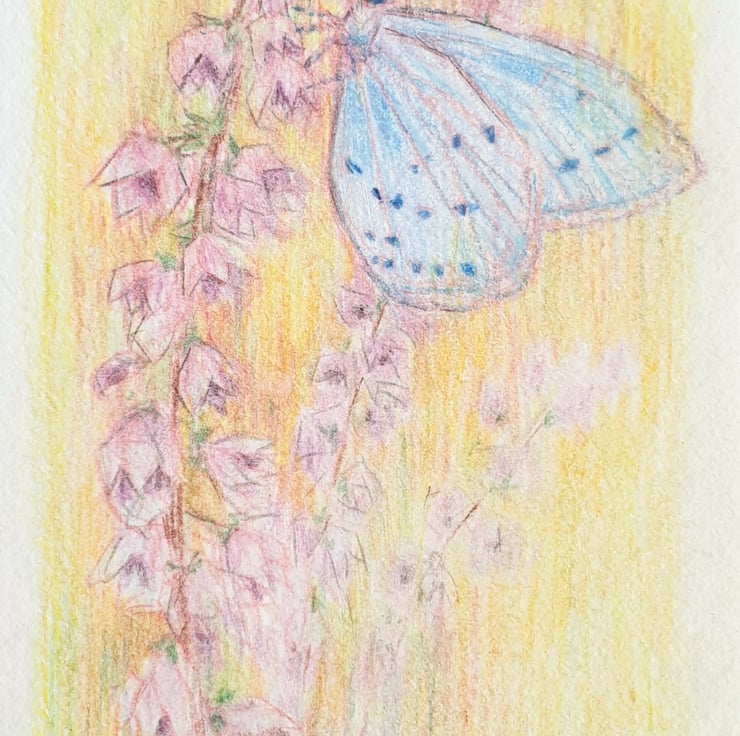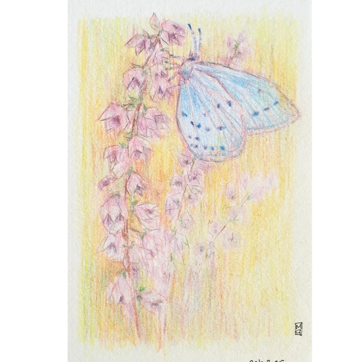 A small drawing of a blue butterfly on a pink flower. The drawing is created in colour pencil and has a very hazy, soft focus effect. The drawing is on white paper.