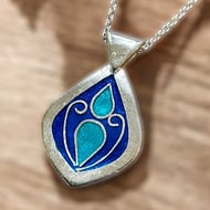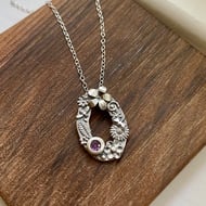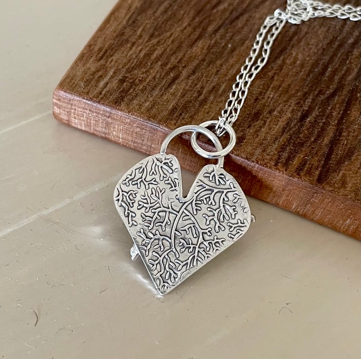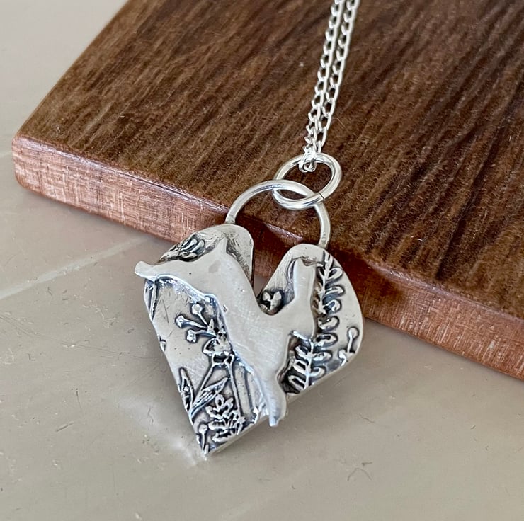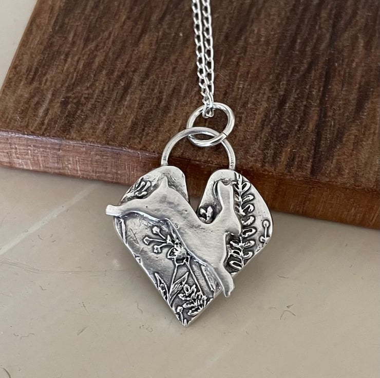 This time a hare leaping through the flowers on a heart shaped backplate. Made from fine silver and patinaed and polished to give a satin finish, this pendant hangs from an 18inch sterling silver chain.