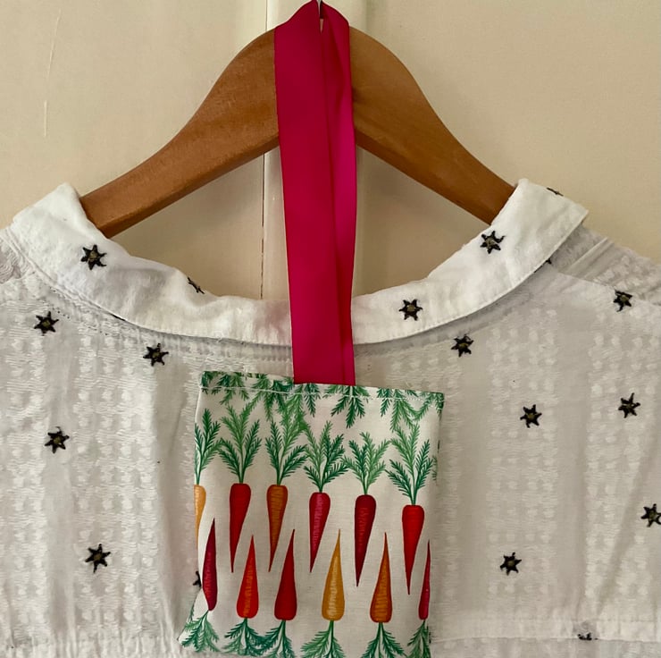Little cotton bags with a bright carrot pattern, filled with air dried Lavender from the garden. Each has a brightly coloured hanging loop so you don’t lose it amongst all those clothes crammed into the wardrobe!
