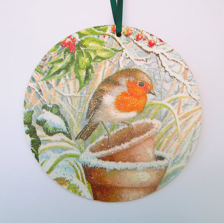 A lovely 10cm decoupage flat wood robin Christmas bauble is just perfect to add to your festive indoor decor this season. I have added some fine silver glitter for a little added sparkle. With a matching green ribbon for hanging, it's ready to hang or to gift. The reverse of the bauble is the natural wood. There maybe an odd crinkle on your ornament, but that is completely normal for anything made with decoupage.