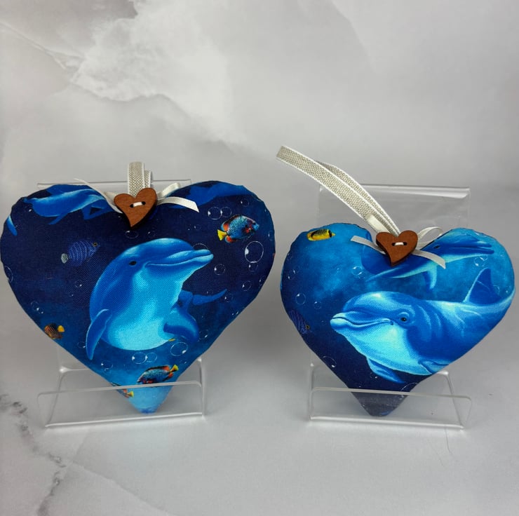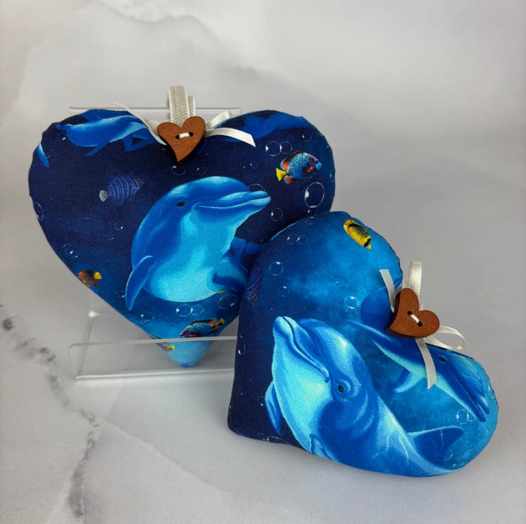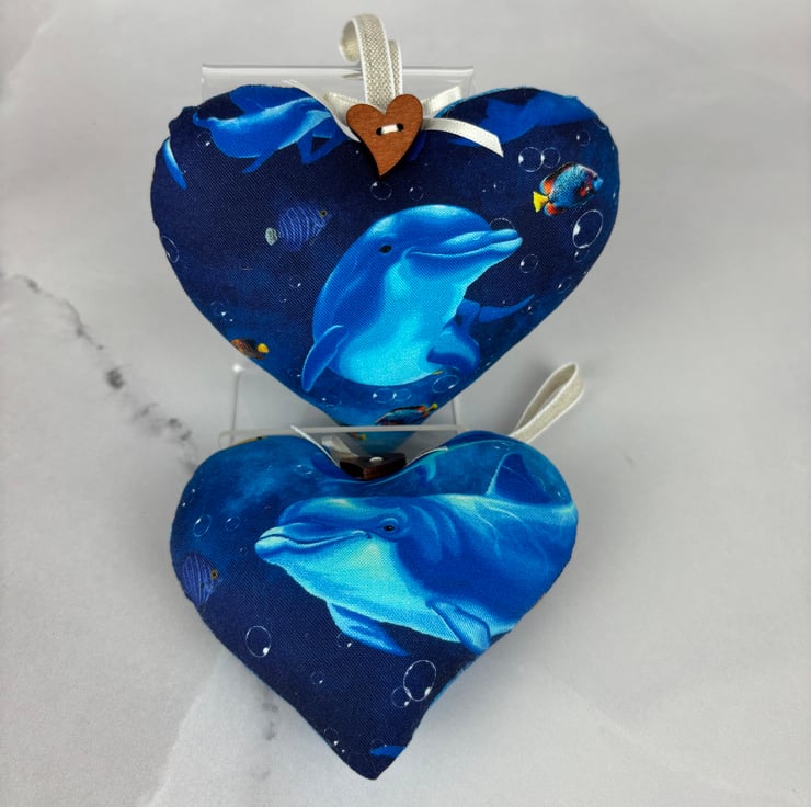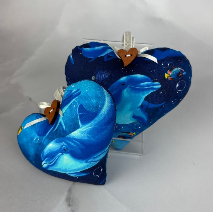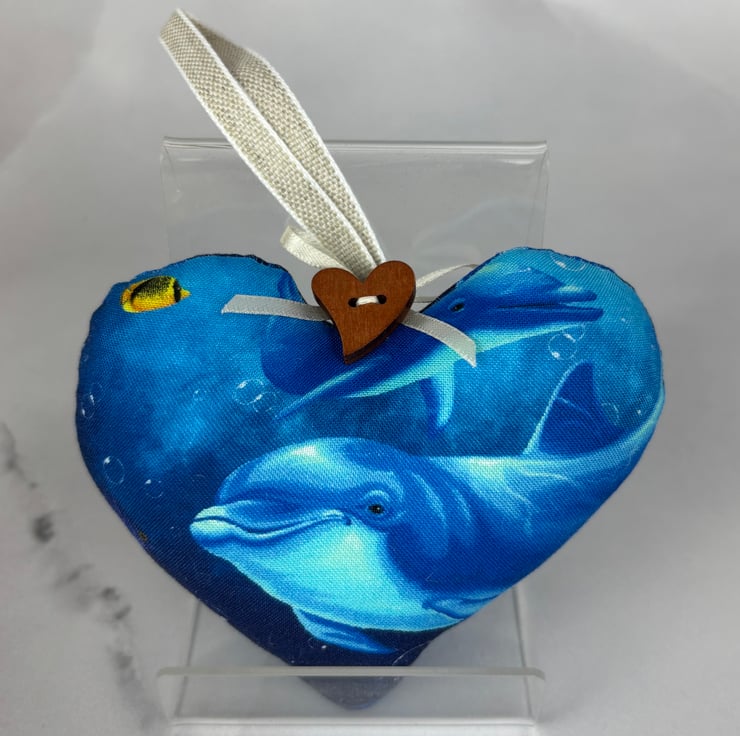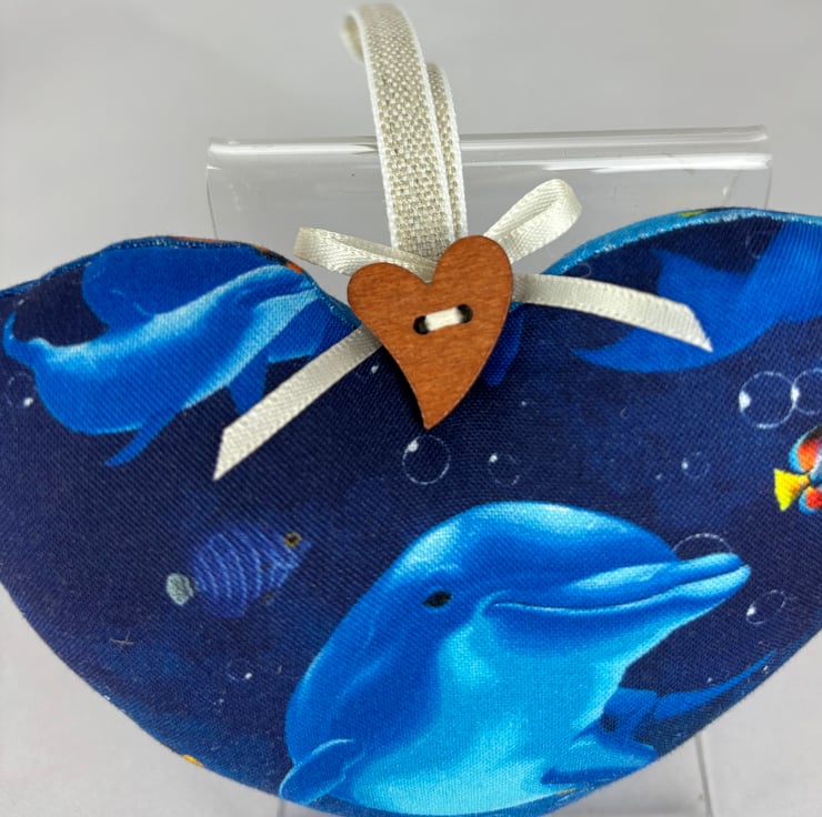 Handmade dolphin fabric heart set in a stunning rich blue cotton fabric with linen ribbon loops, wooden heart button and ribbon bow.