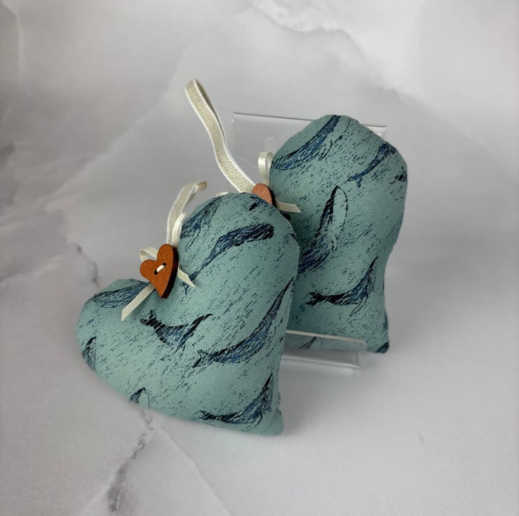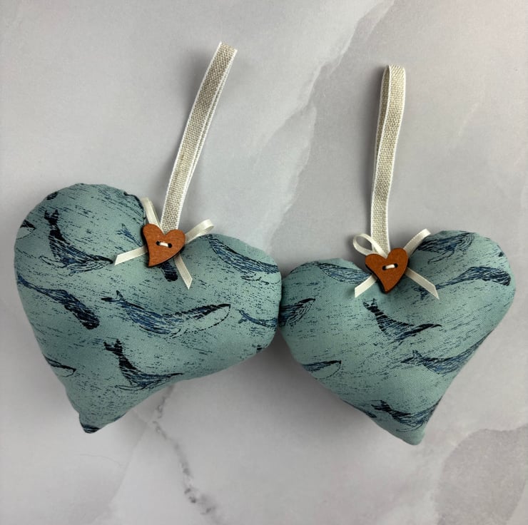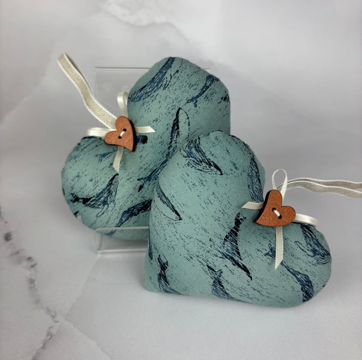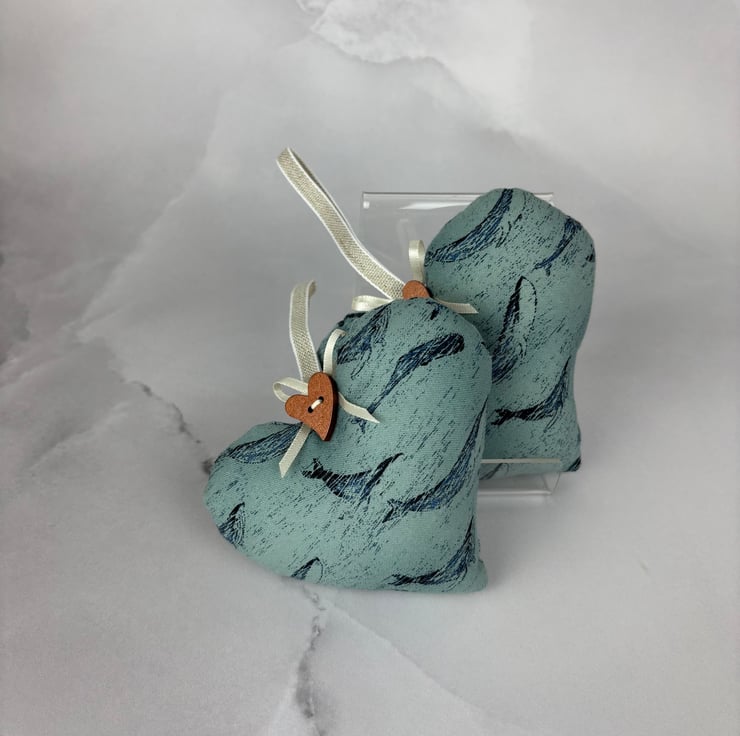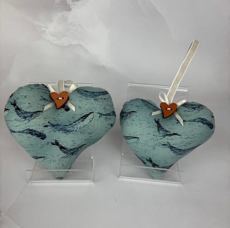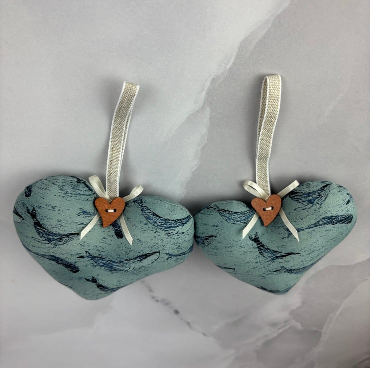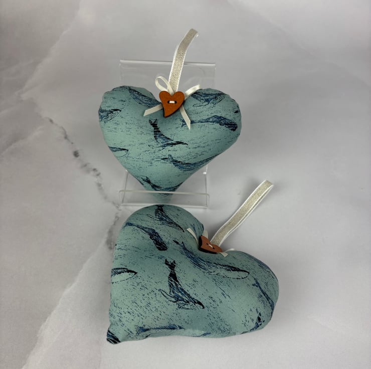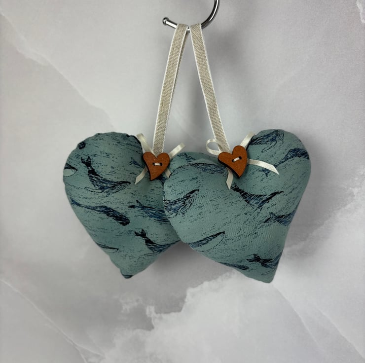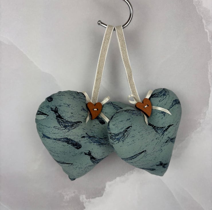 Handmade whales fabric heart set in a beautiful dusky blue cotton fabric with linen ribbon loops, wooden heart button and ribbon bow.