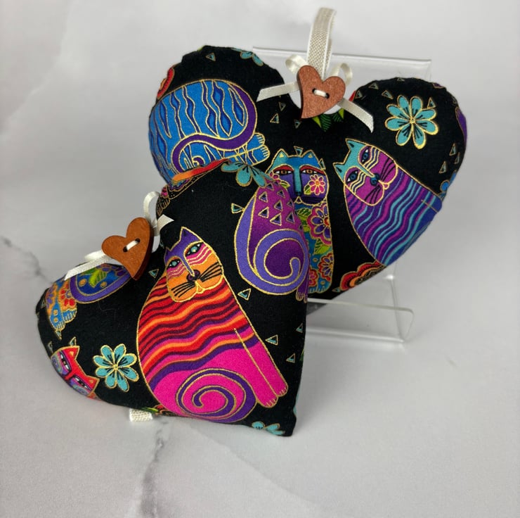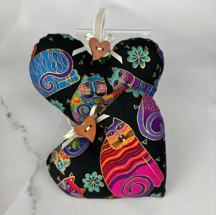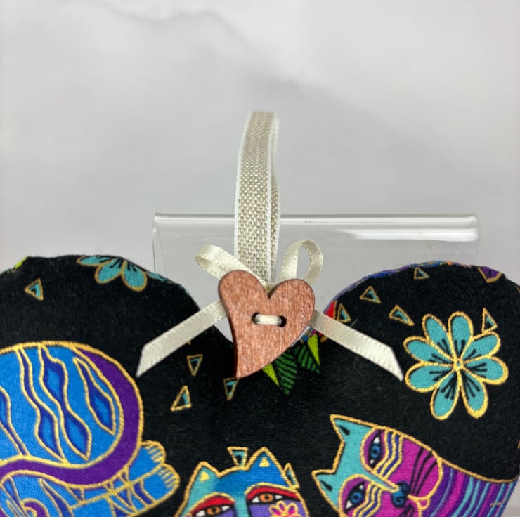 Handmade tumbling cats fabric heart set in a stunning gold accented cotton fabric with linen ribbon loops, wooden heart button and ribbon bow.