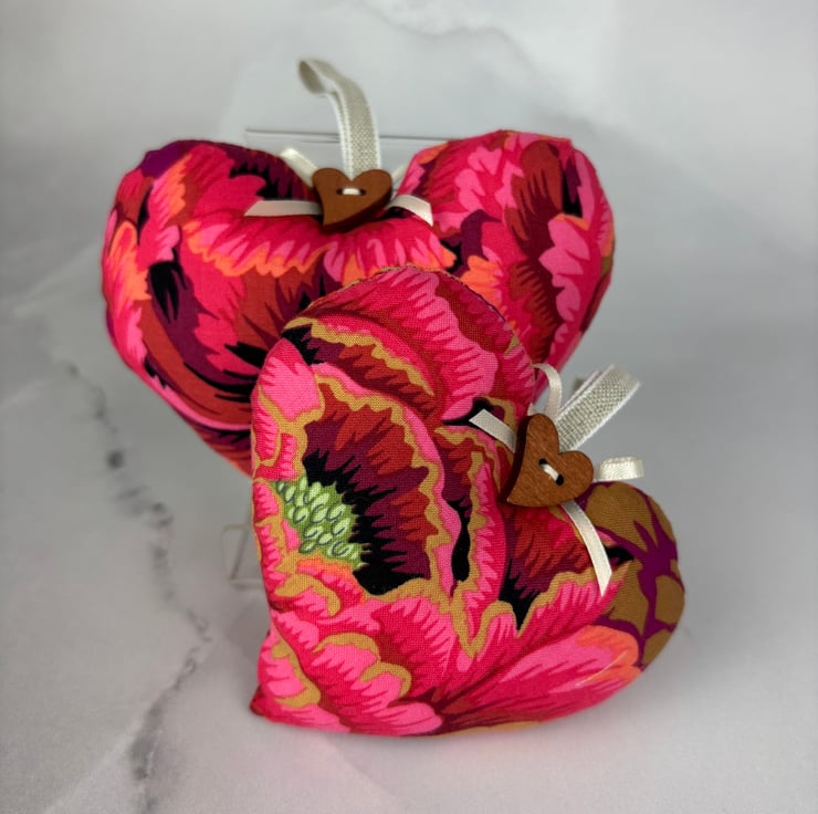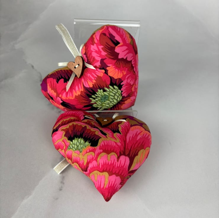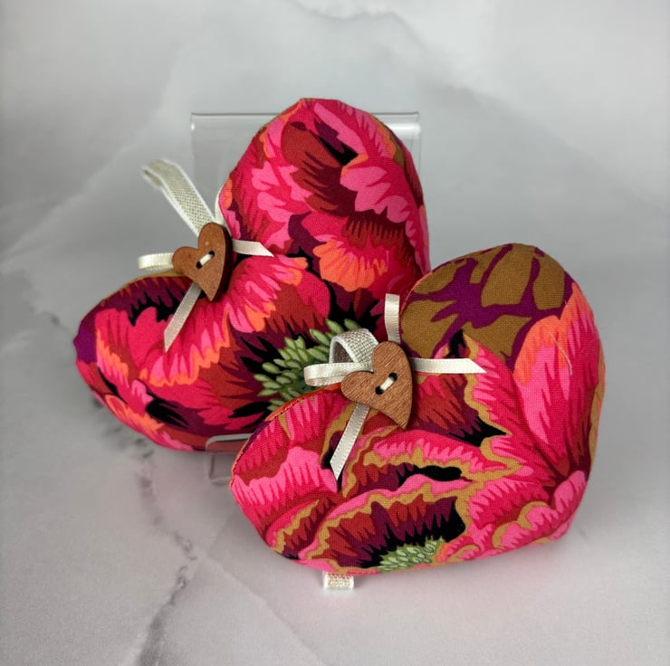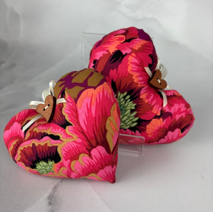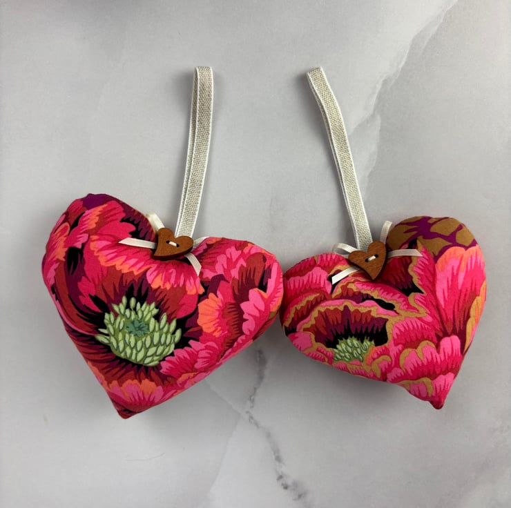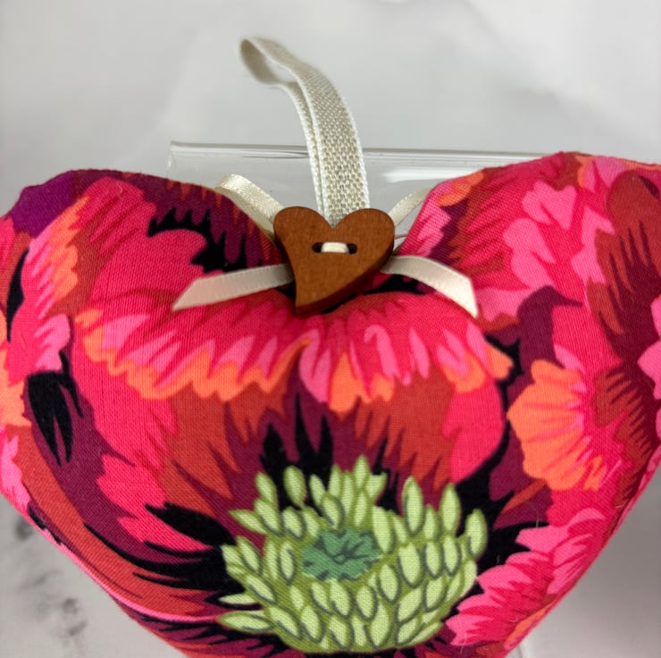 Handmade peony flowers fabric heart set in a bold cotton fabric with linen ribbon loops, wooden heart button and ribbon bow.