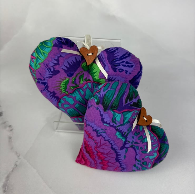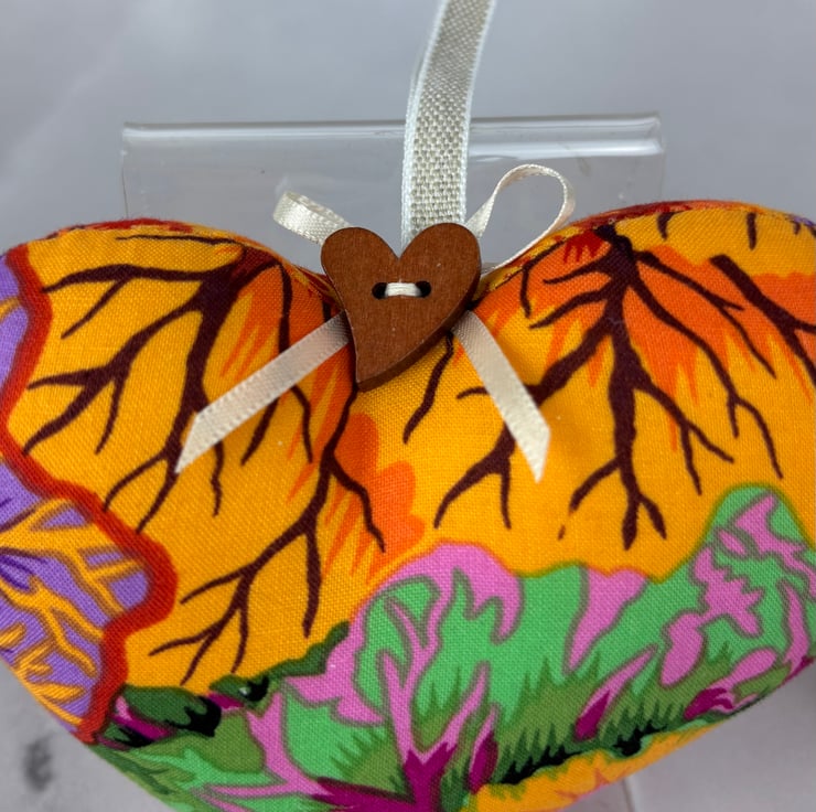 Handmade floral fabric heart set in a bold brassica cabbages cotton fabric with linen ribbon loops, wooden heart button and ribbon bow.