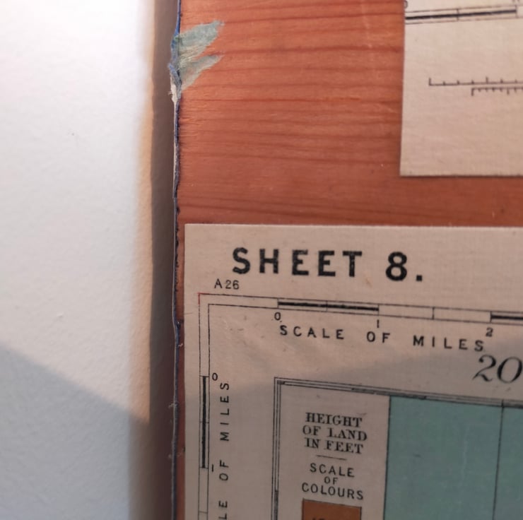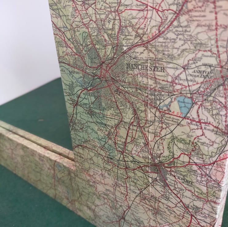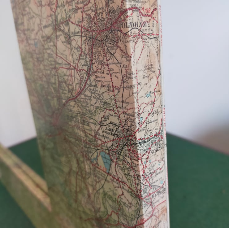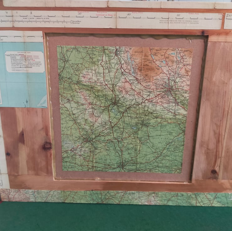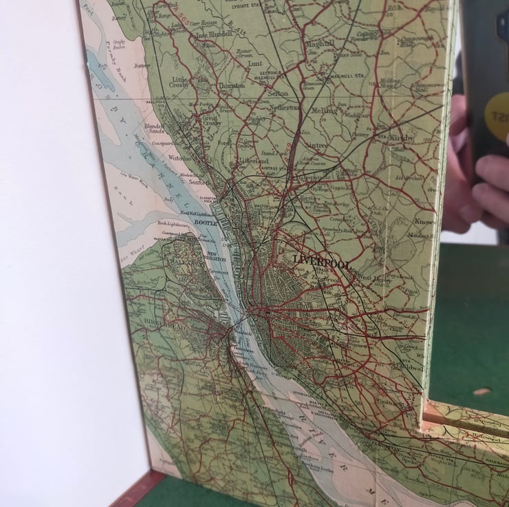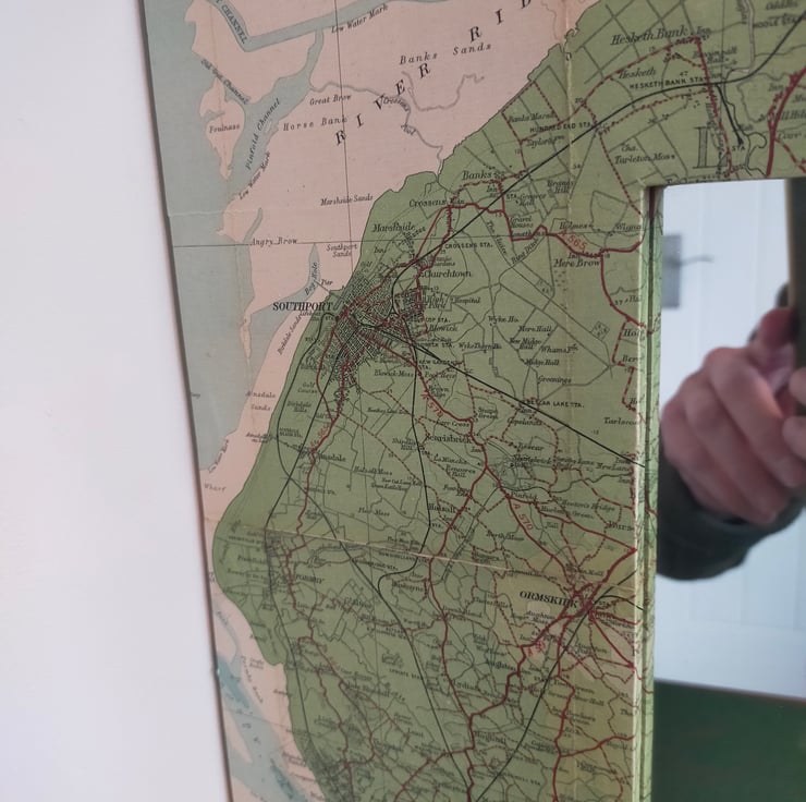 Whether you're from Manchester, Liverpool or the bits in between, coming from the North West is something to be proud of, and this mirror celebrates that heritage. The frame is made bespoke from reclaimed pine so as to fit a good portion of the Bartholomew map. These maps, now sadly no more, are far more colourful and decorative than their OS equivalents, and this very rare example predates when the map of this area became Sheet 28, as this one covers the Ribble Estuary as well. It is broadly titled Merseyside which is, I suppose, strictly true as the Mersey begins in Stockport. Sincere apologies to the citizens of Warrington and Wigan for placing the mirror over your patch, but the missing towns are glued to the back. This mirror makes for a wonderful talking point as there is so much more green and undeveloped land than nowadays, particularly with this one nearly a hundred years old.