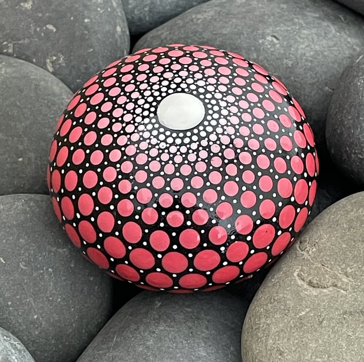Pink and red hand painted original and unique dot Mandala art stone - This dot Mandala art stone is a unique and beautifully crafted décor piece, hand cast in the finest quality gypsum, painted with quality artists acrylic paint and protected by a high gloss glaze for added durability. The intricate dot design on the stone creates a beautiful and eye-catching geometric pattern, making it the perfect gift as a paperweight or decorative item for any indoor space. Ideal for adding a touch of charm to your home or as a thoughtful gift for someone who appreciates hand-crafted items, this one-of-a-kind piece is sure to stand out and make a statement in any room.