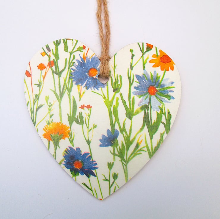 A lovely 10cm decoupage heart flat wood floral ornament is just perfect to add to your indoor decor for any season. It has jute twine for hanging, so it's ready to display or to gift. The reverse of the ornament is the natural wood. There maybe an odd crinkle on your ornament, but that is completely normal for anything made with decoupage.