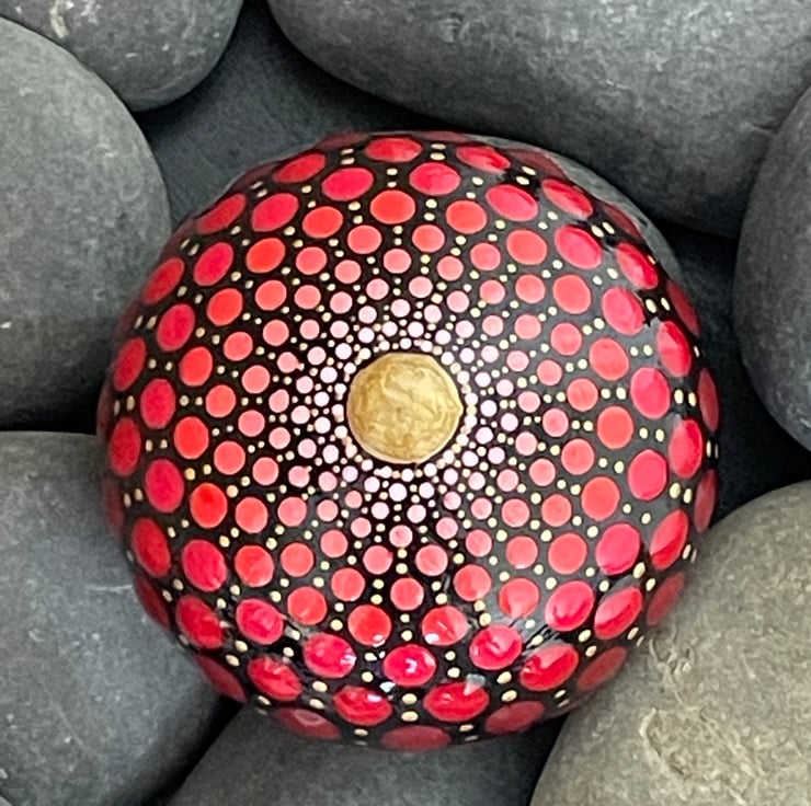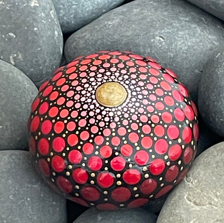 Red hand painted original and unique dot Mandala art stone - This dot Mandala art stone is a unique and beautifully crafted décor piece, hand cast in the finest quality gypsum, painted with quality artists acrylic paint and protected by a high gloss glaze for added durability. The intricate dot design on the stone creates a beautiful and eye-catching geometric pattern, making it the perfect gift as a paperweight or decorative item for any indoor space. Ideal for adding a touch of charm to your home or as a thoughtful gift for someone who appreciates hand-crafted items, this one-of-a-kind piece is sure to stand out and make a statement in any room.