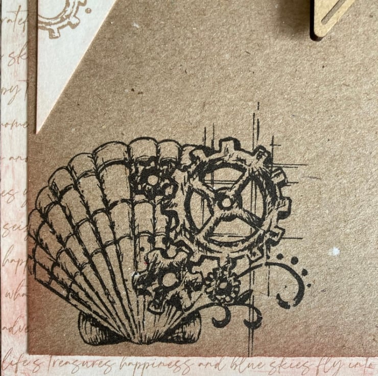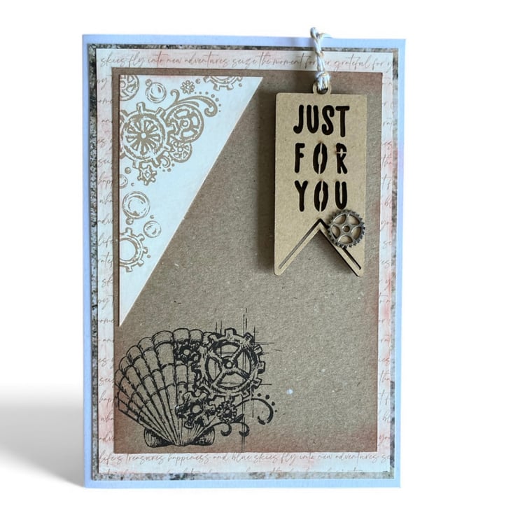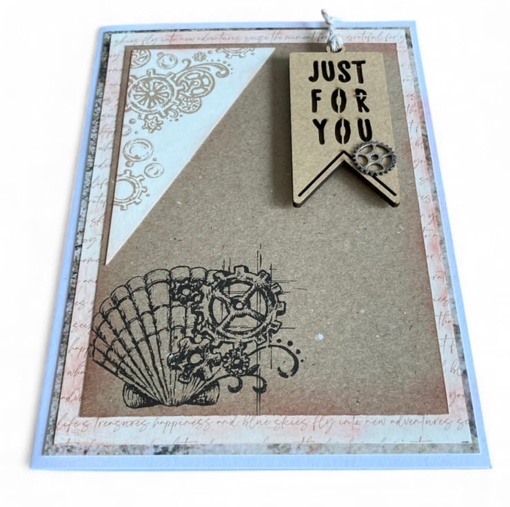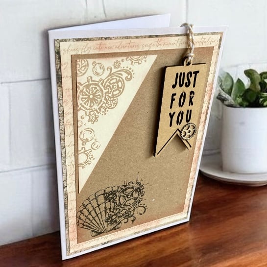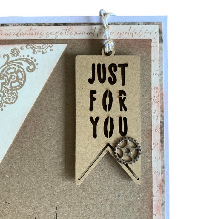 This card features a layered textured look with a stamped Kraft layer. A natural wooden keepsake tag laser cut with the words “Just for You”, with a metal gear embellishment for that signature steampunk aesthetic has been added.