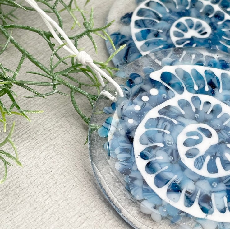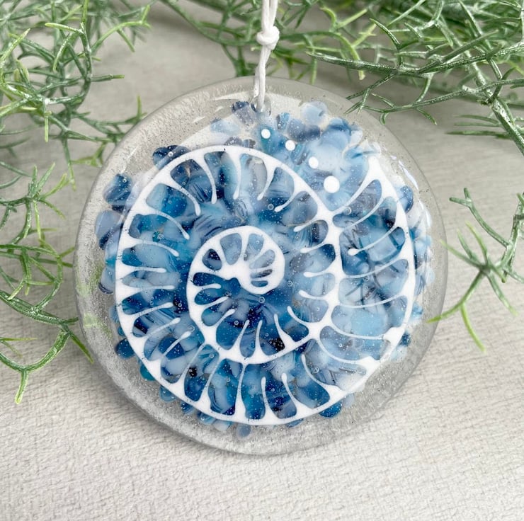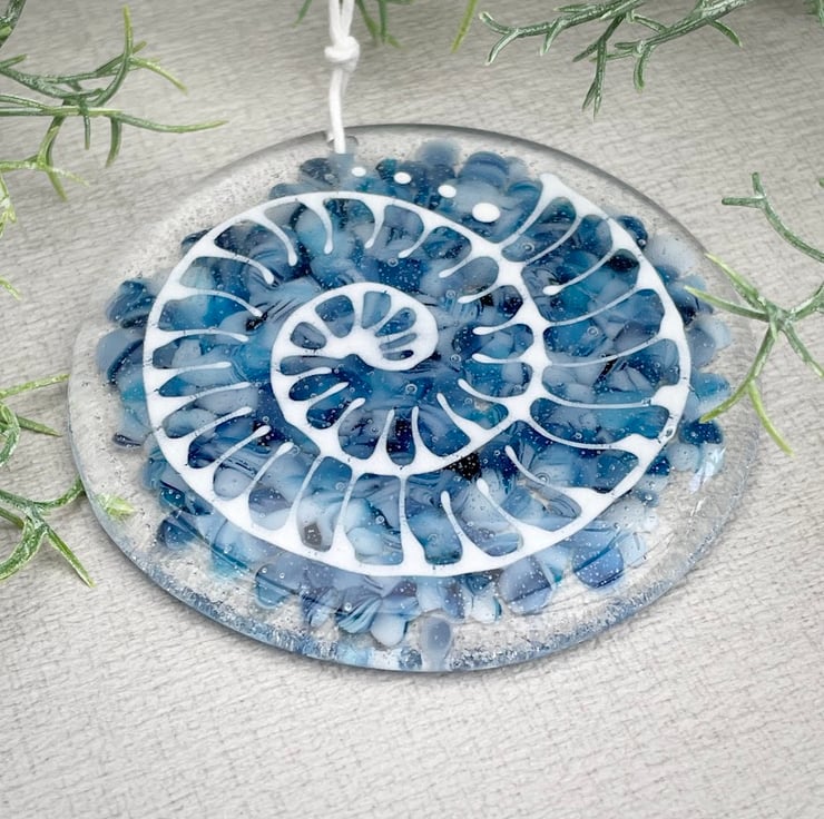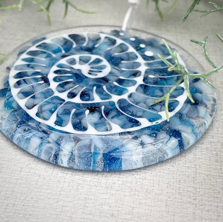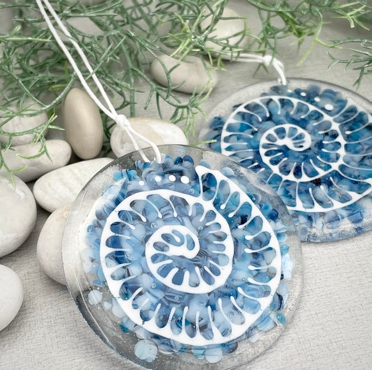 Ammonite decorations - hand painted and twice fired, these fused glass decorations have a perfectly smooth pebble finish There is real depth to the glass, and feels weighty and substantial!