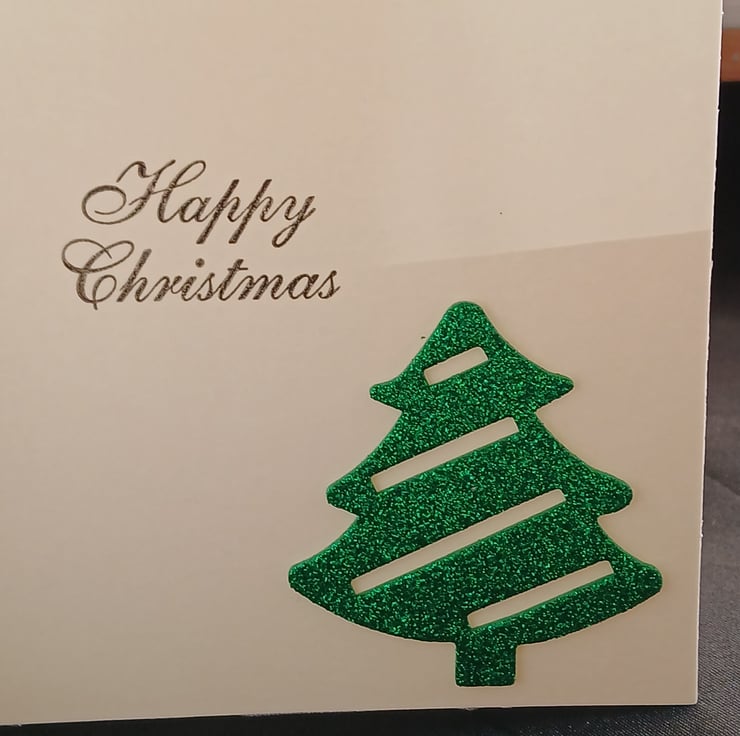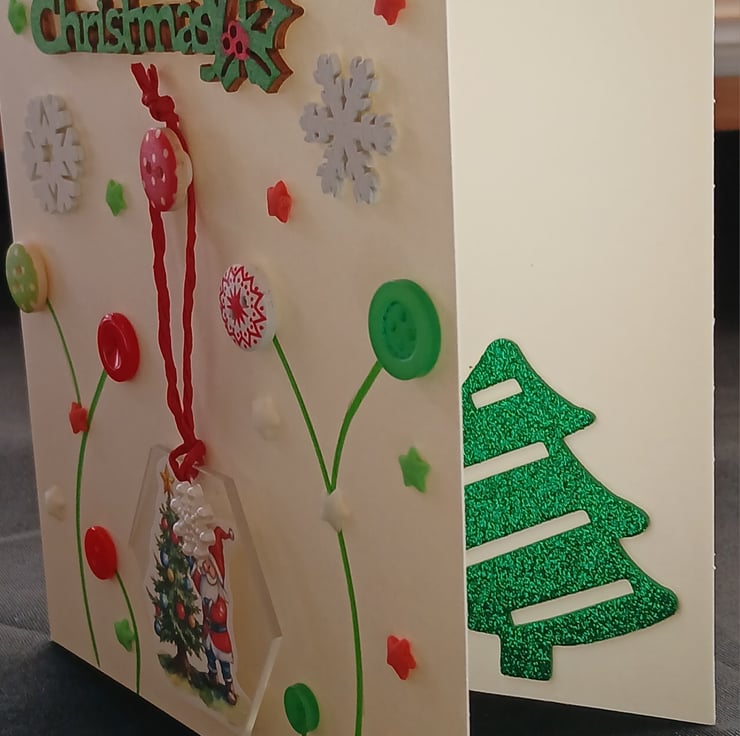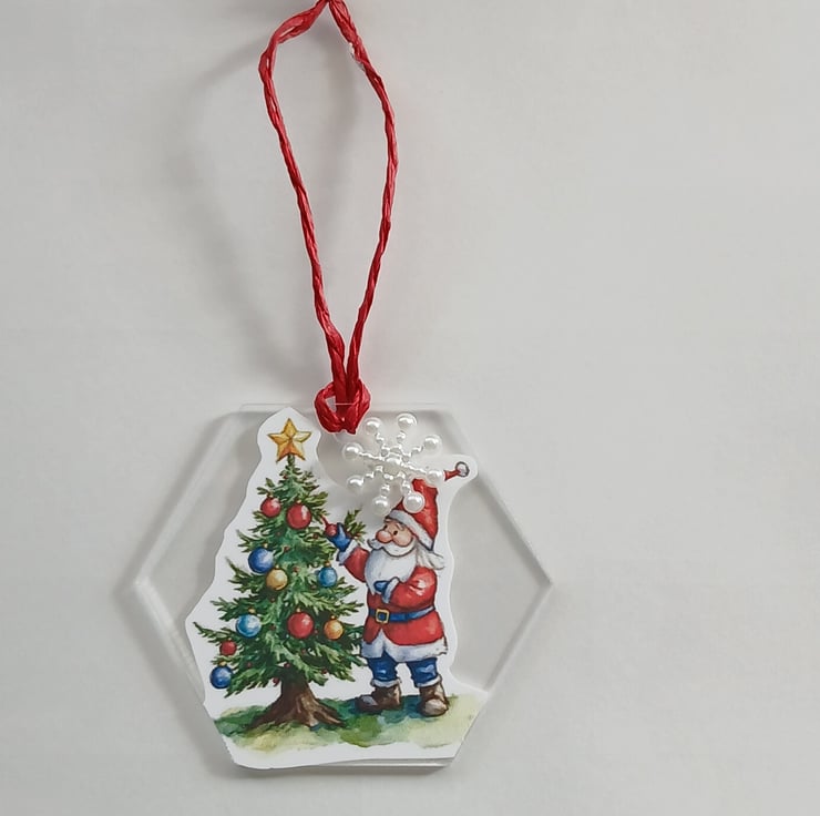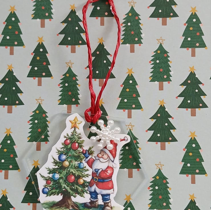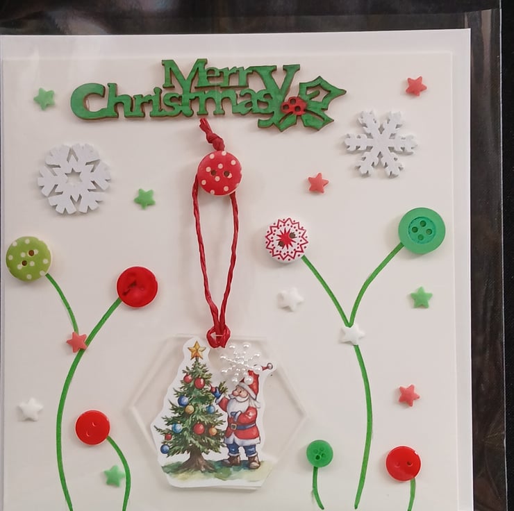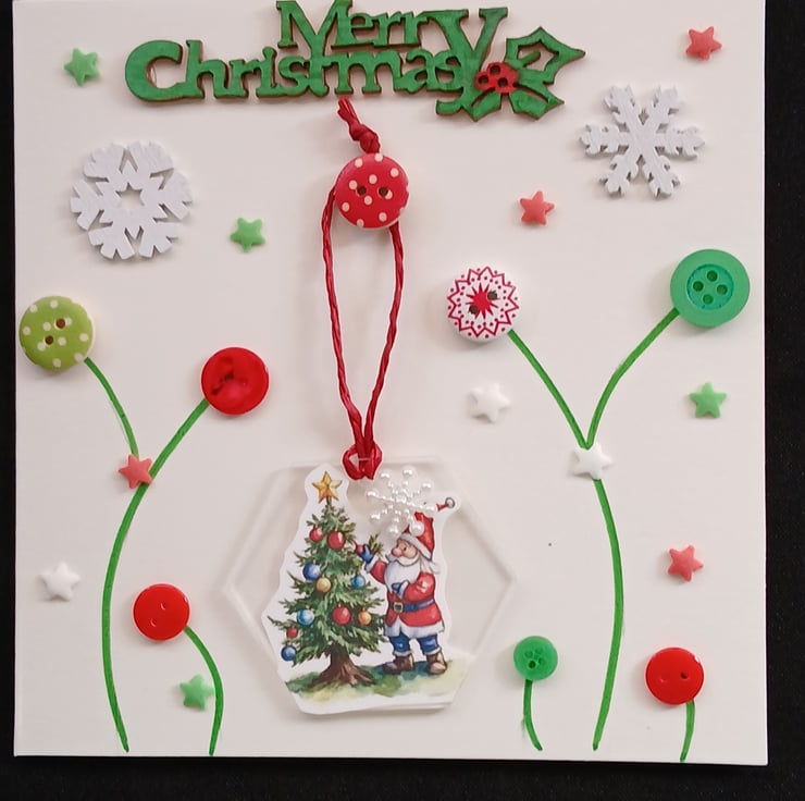 Handmade christmas card, incorporates a clear acrylic Christmas decoration with a Santa design.