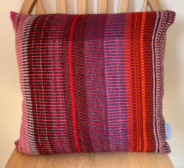 This one-of-a-kind cushion cover comes complete with its inner pad. Hand woven using British wool in a warm colour palette of pinks, creams and greys.