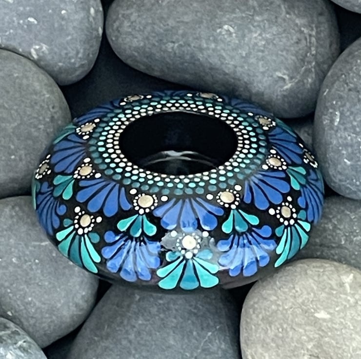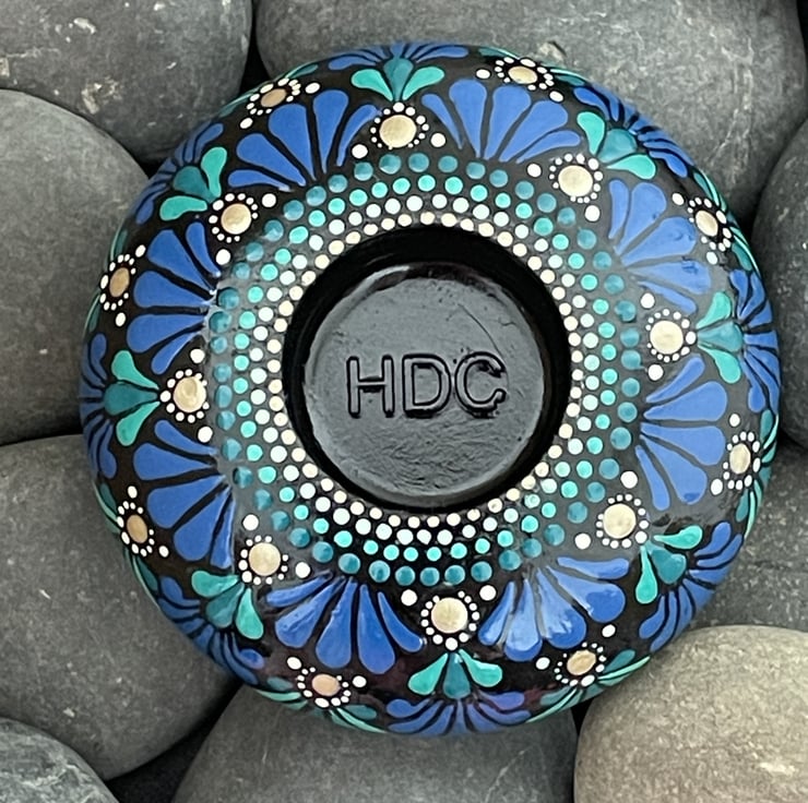 Blue hand painted, original and unique dot Mandala tea light candle holder - This dot Mandala art candle holder is a unique and beautifully crafted décor piece, hand cast in the finest quality gypsum, painted with quality artists acrylic paint and protected by a high gloss glaze for added durability. The intricate dot design on the stone creates a beautiful and eye-catching design, making it the perfect gift or decorative item for any indoor space. Ideal for adding a touch of charm to your home or as a thoughtful gift for someone who appreciates hand-crafted items, this one-of-a-kind piece is sure to stand out and make a statement in any room.