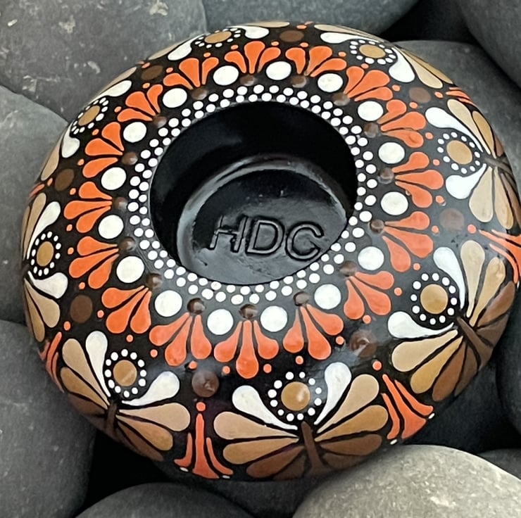 Orange hand painted, original and unique dot Mandala tea light candle holder - This dot Mandala art candle holder is a unique and beautifully crafted décor piece, hand cast in the finest quality gypsum, painted with quality artists acrylic paint and protected by a high gloss glaze for added durability. The intricate dot design on the stone creates a beautiful and eye-catching design, making it the perfect gift or decorative item for any indoor space. Ideal for adding a touch of charm to your home or as a thoughtful gift for someone who appreciates hand-crafted items, this one-of-a-kind piece is sure to stand out and make a statement in any room.
