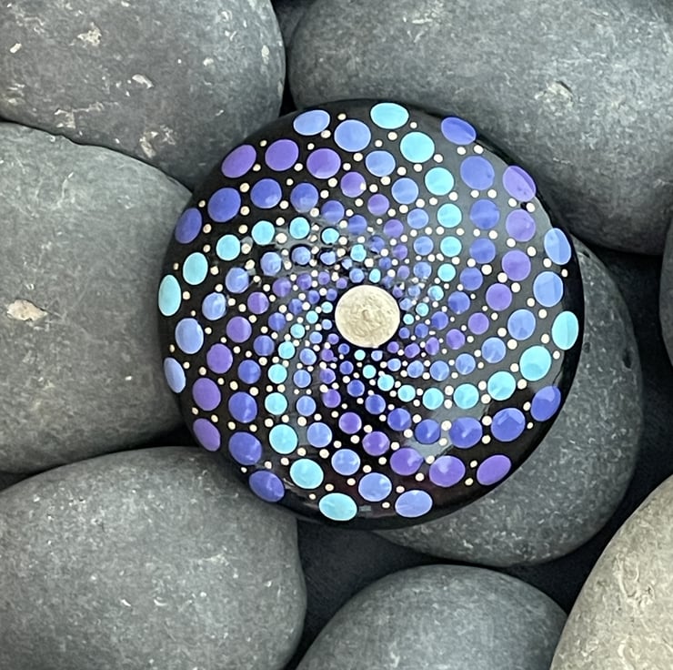 This Mandala stone has been hand painted by myself under the artist name of Natures Palette.