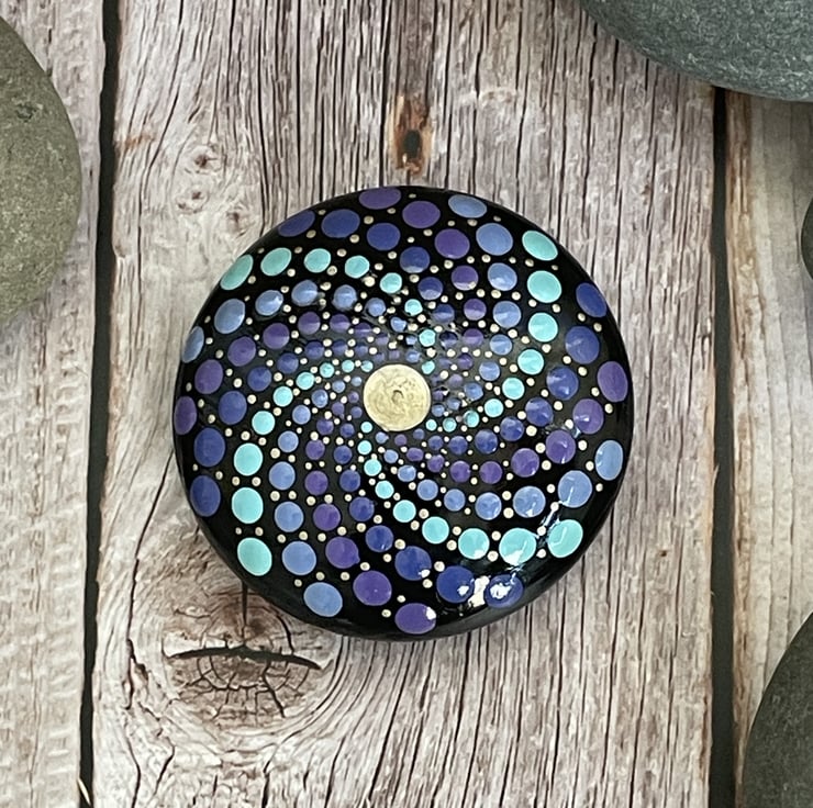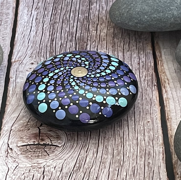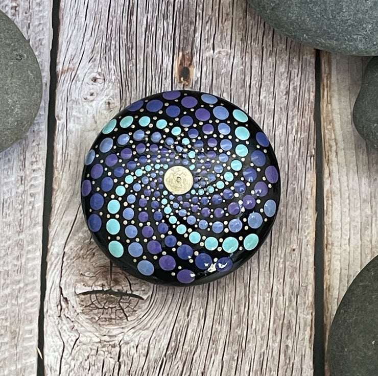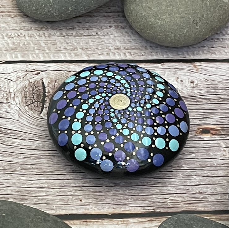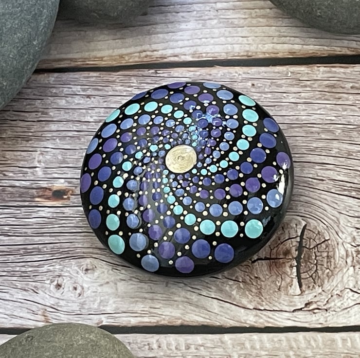 This Mandala stone has been hand painted by myself under the artist name of Natures Palette.